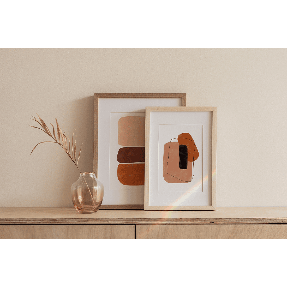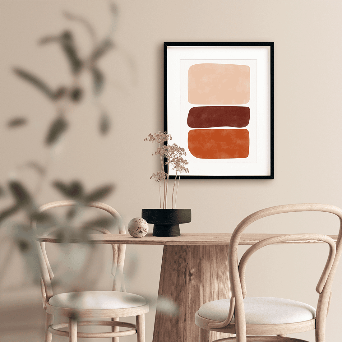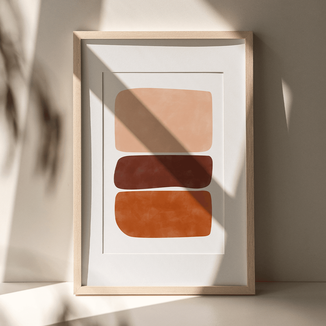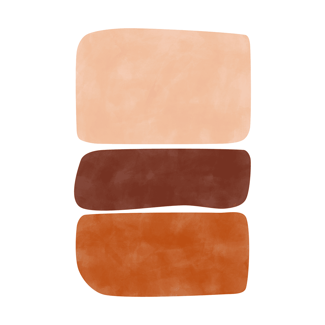 Graphical illustration of three abstract shapes in terracotta shades on a white background. Combine this abstract print with the Abstract Art Poster No.2 for a modern and classy decoration.