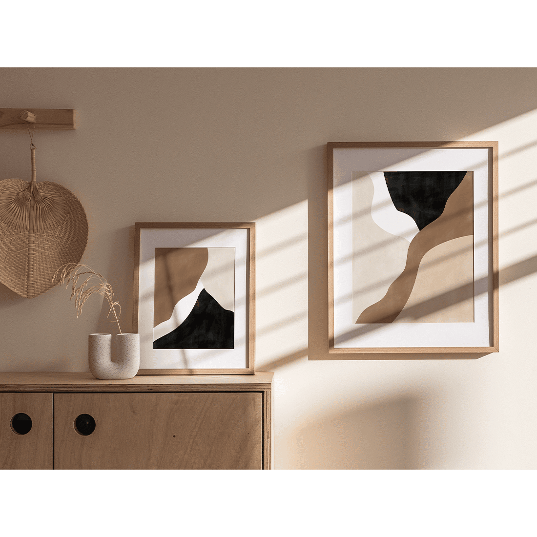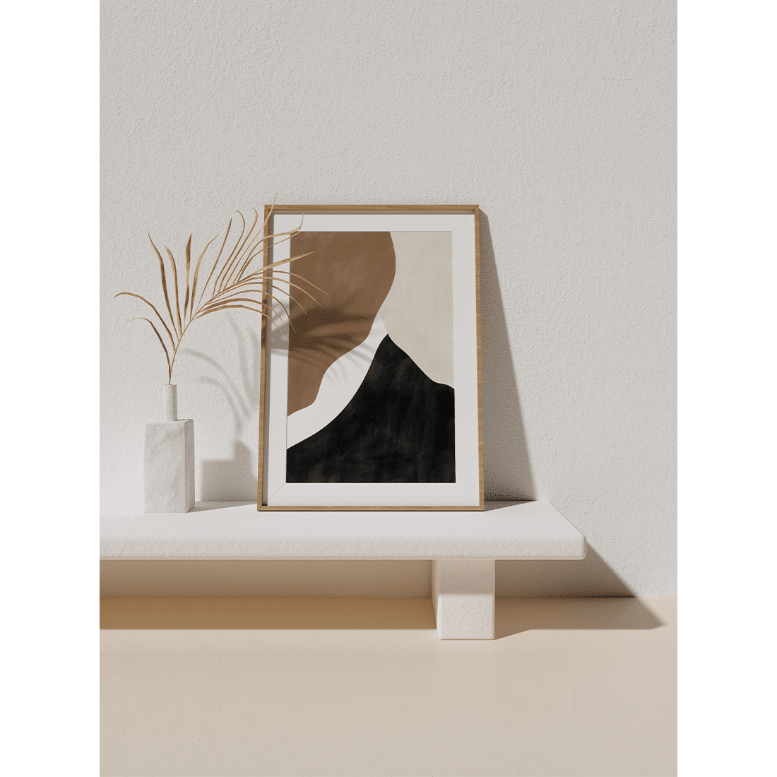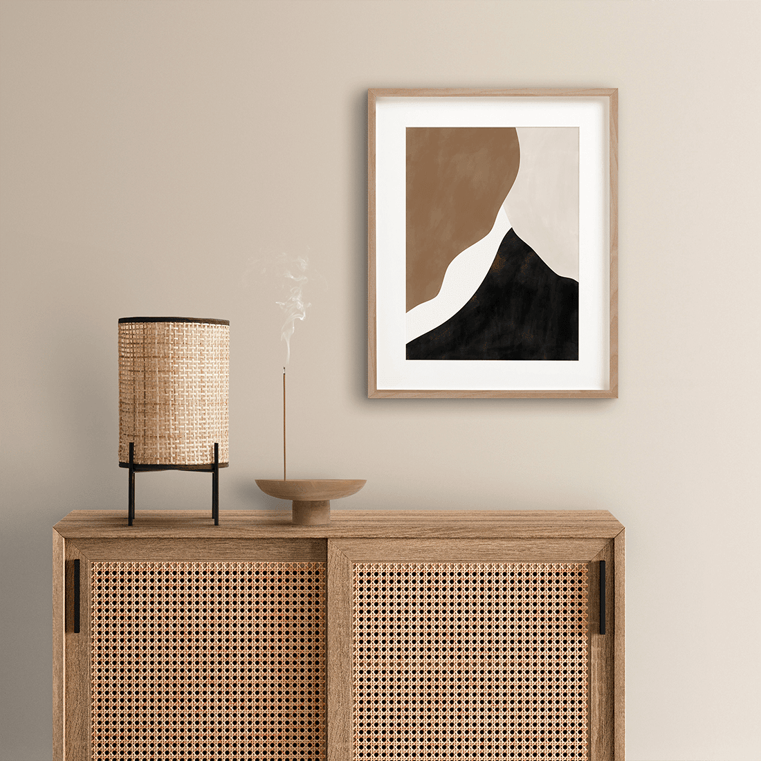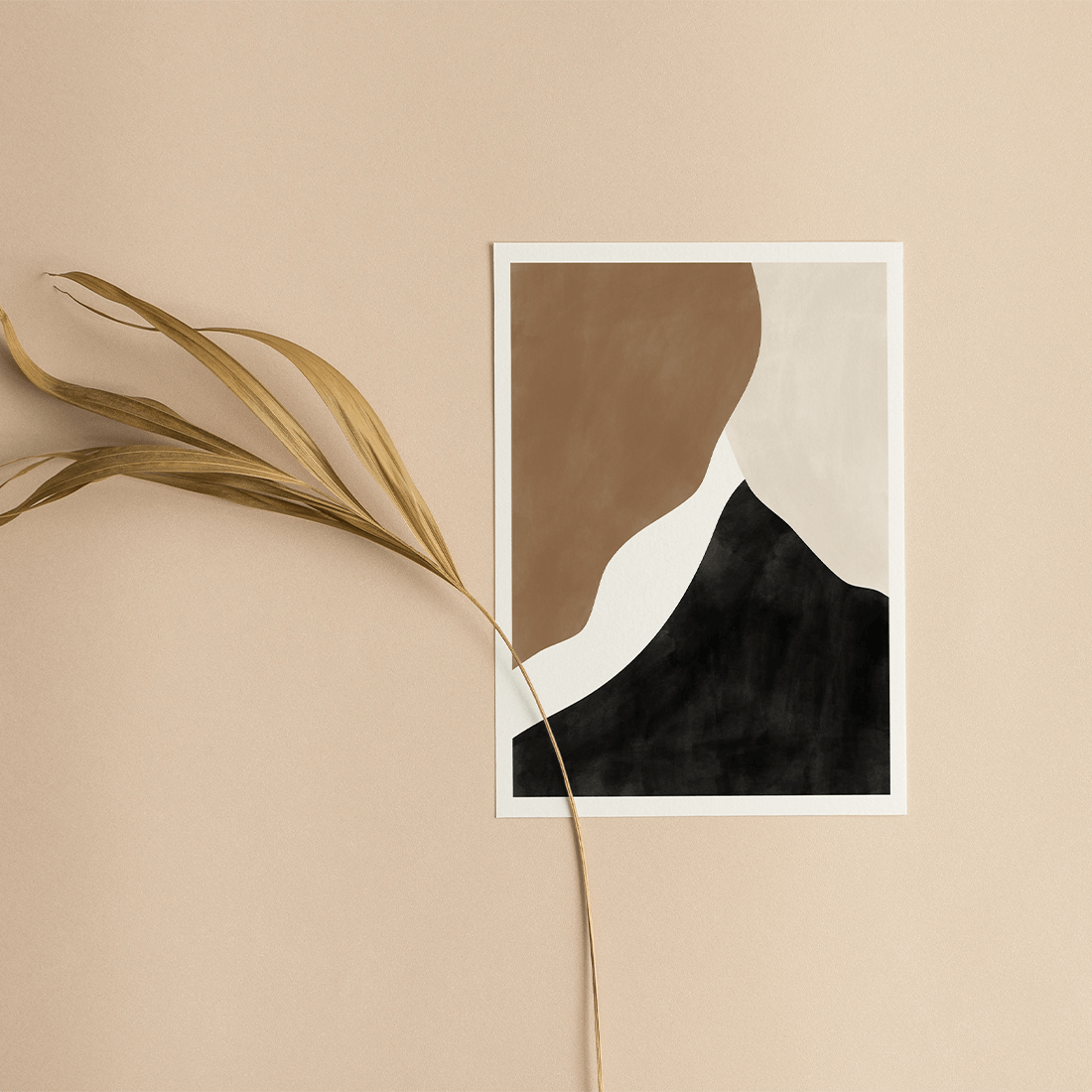 Abstract painting with cream, beige and black overlapping shapes with textured colour effect. A neutral colour palette with some darker accent shades will create a subtle contrast! This print matches perfectly with Abstract Brown Poster No.2.