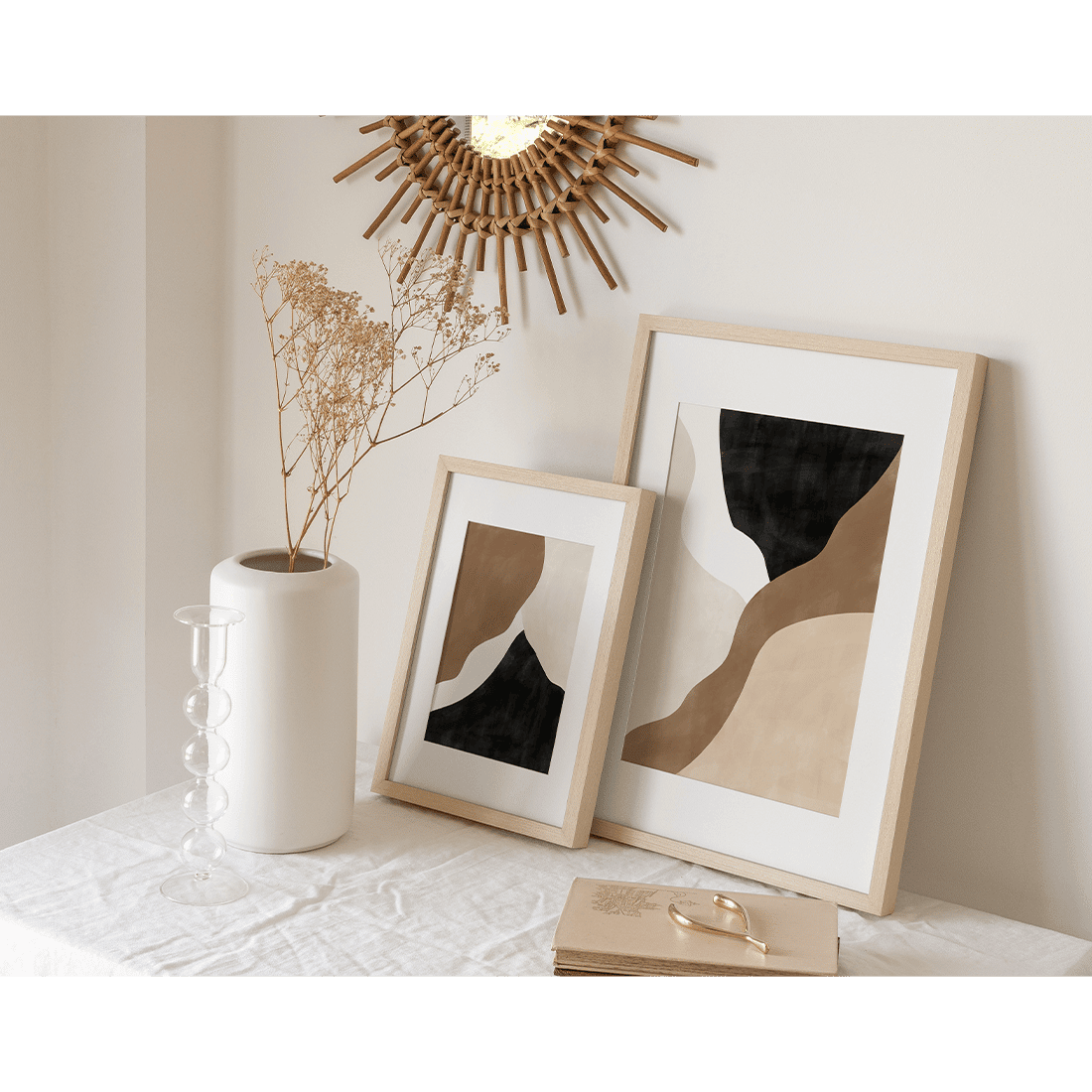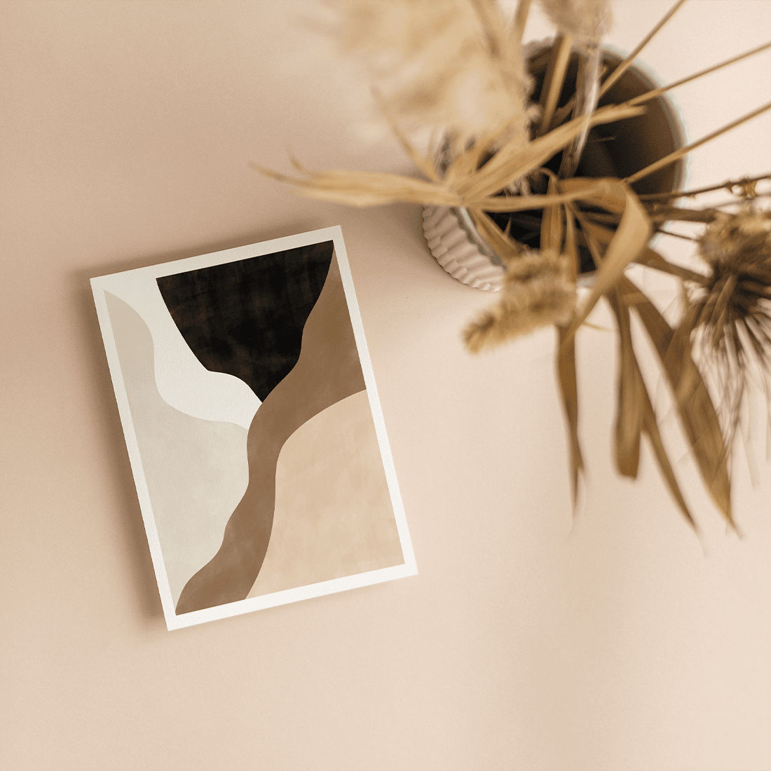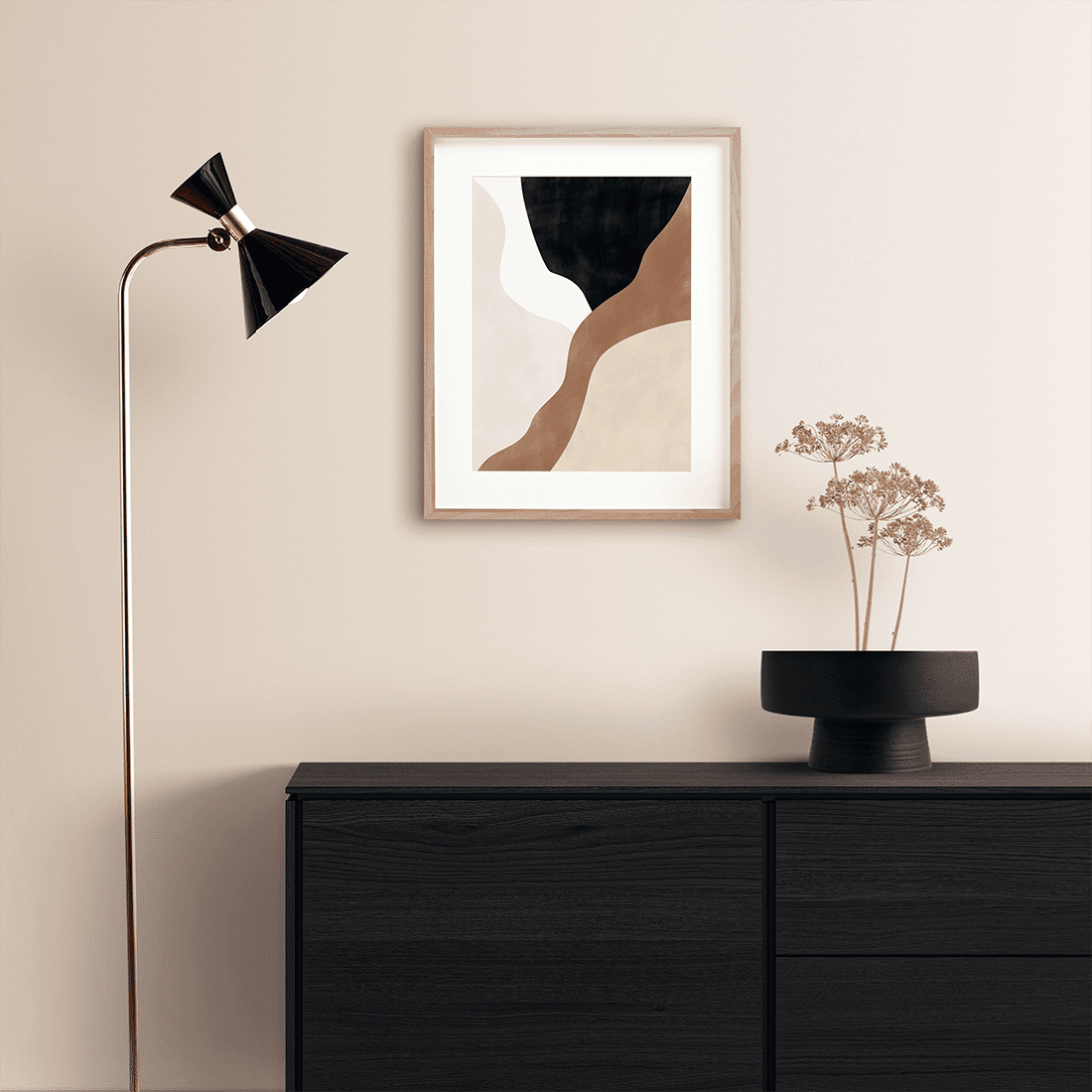 Abstract painting with cream, beige and black overlapping shapes with textured colour effect. A neutral colour palette with some darker accent shades will create a subtle contrast! This print matches perfectly with Abstract Brown Poster No.1.