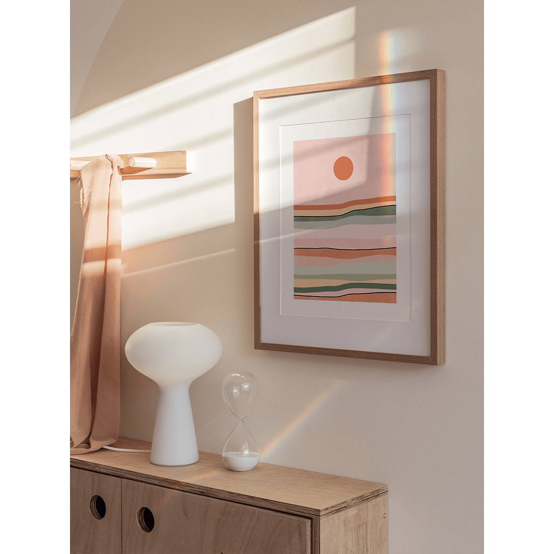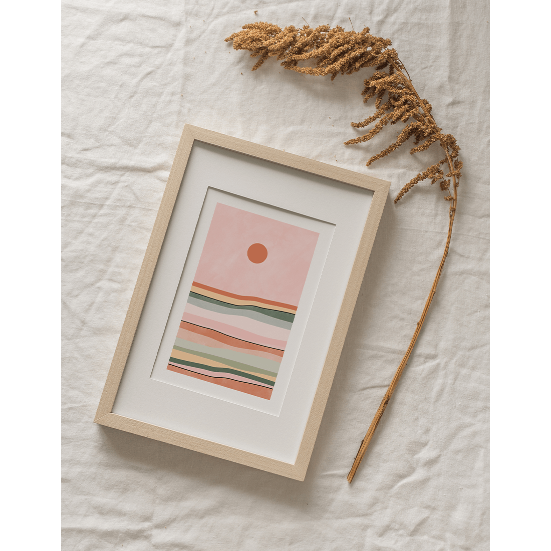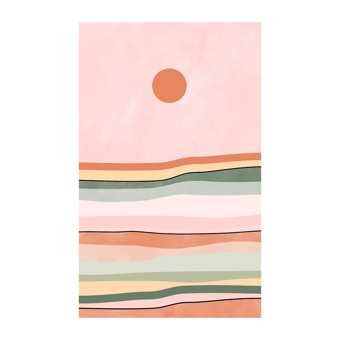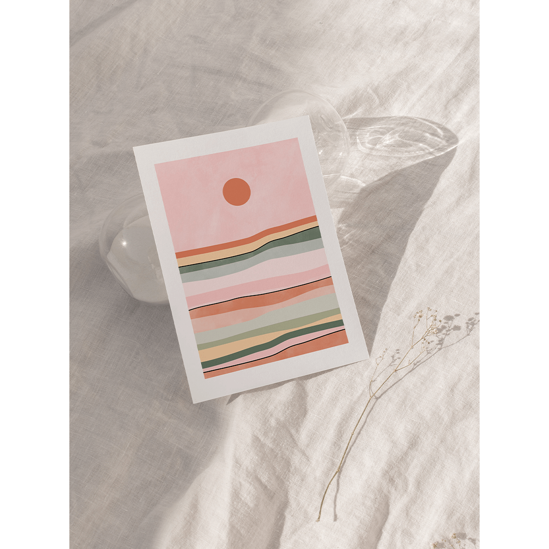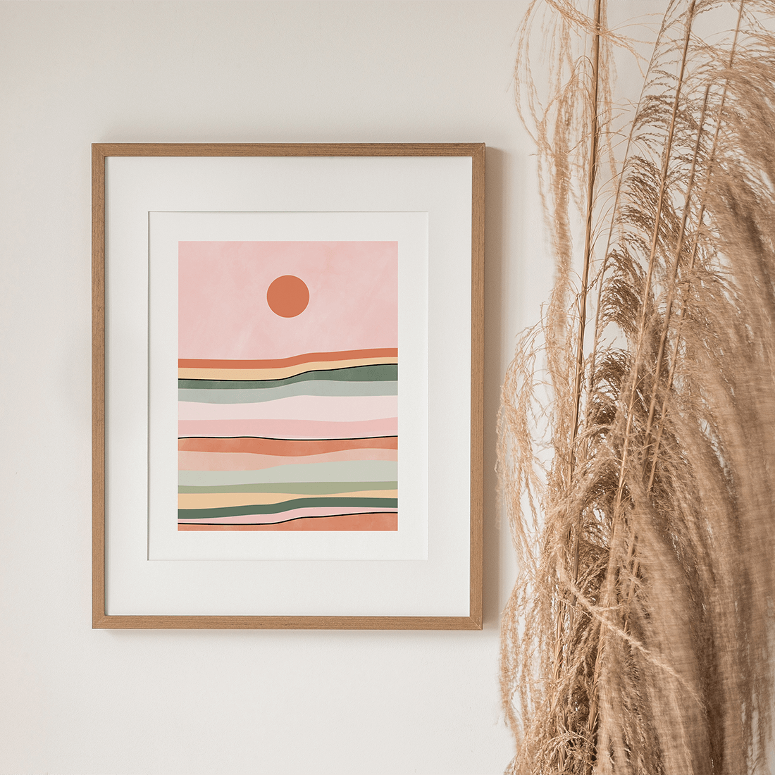 Painting of an abstract landscape on the countryside with pink sky and sunset. Create a gallery wall with nature prints to give your room calming feel and style!