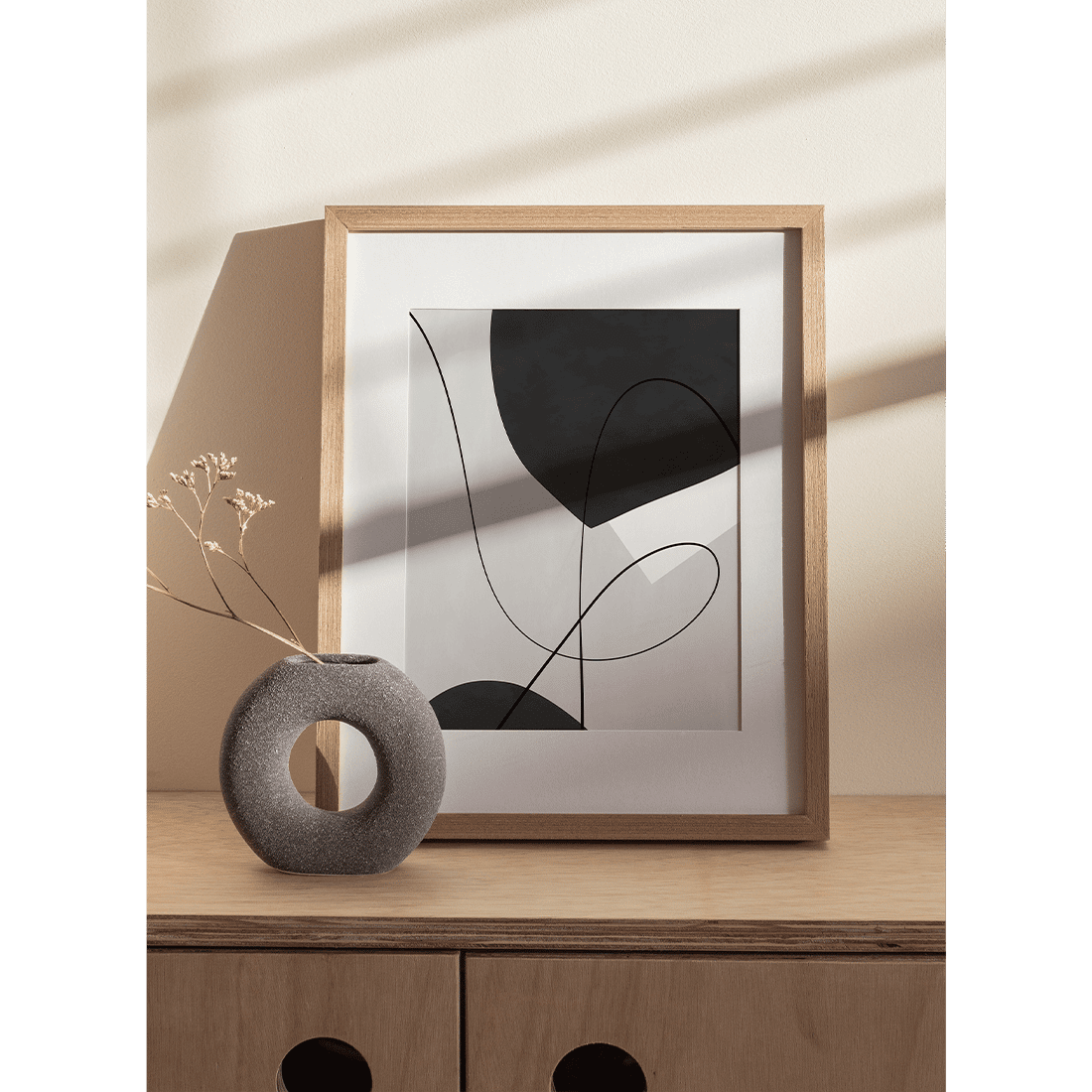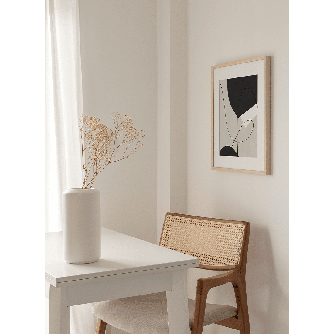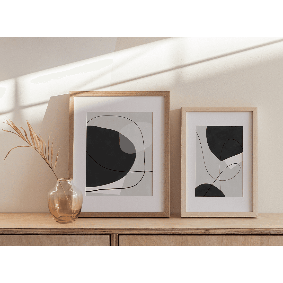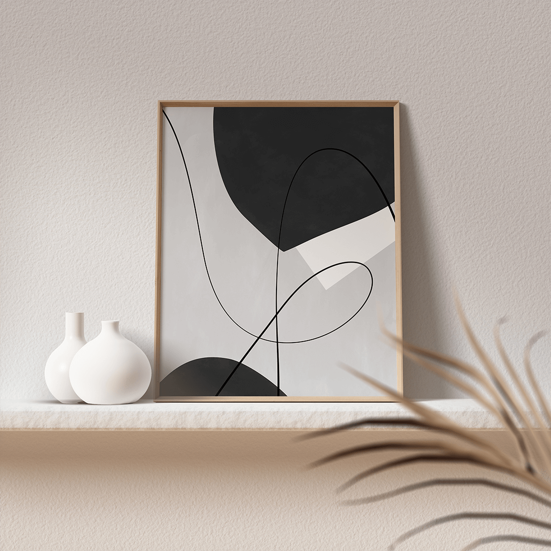Abstract painting with thin lines in black and organic shapes in black and white on a light grey background. For a perfect pair you can match this print with Abstract Monochromes Poster No.1.