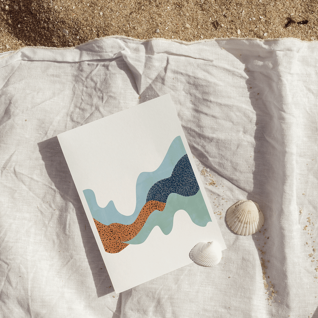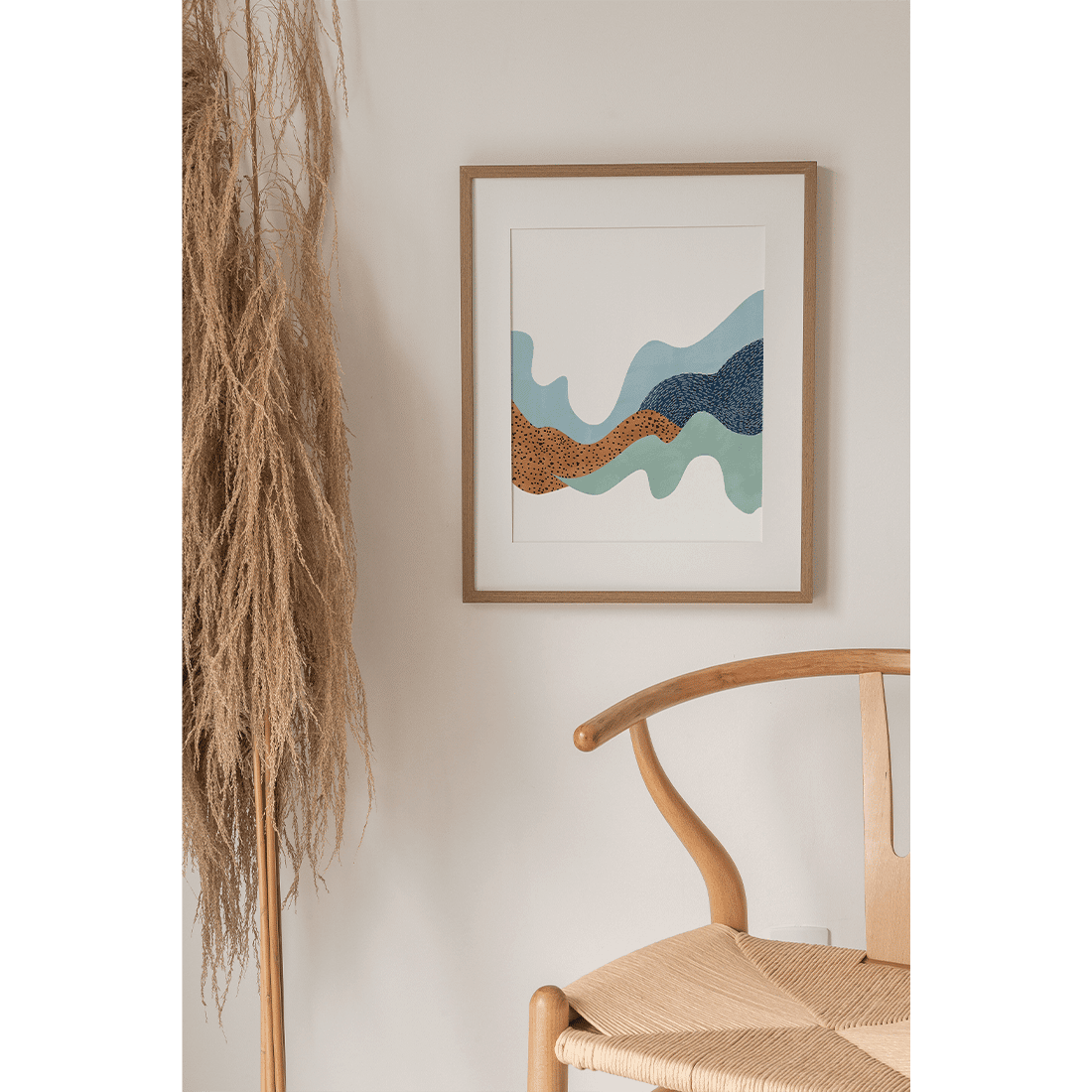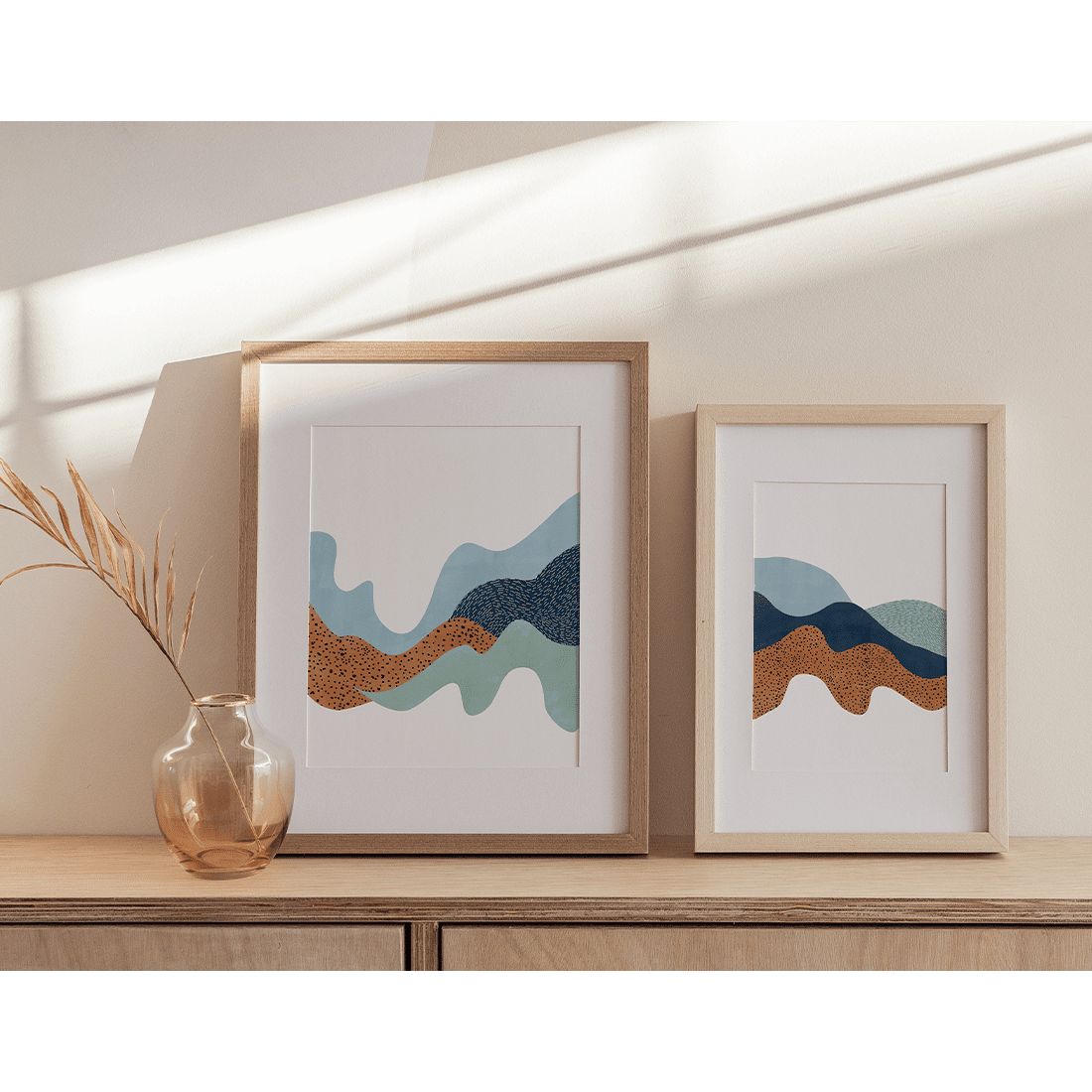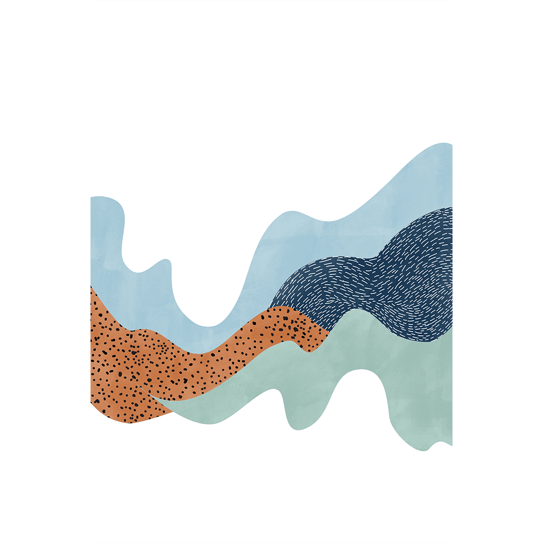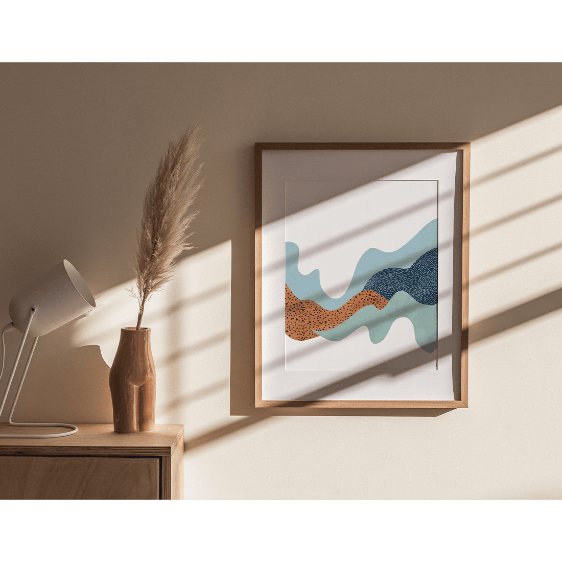Graphic illustration with abstract shapes in blue, dark orange and teal forming a wave on a white background. Give your walls a new look with some colour! Pair this print with Abstract Waves Poster No.1 for a perfect pair.