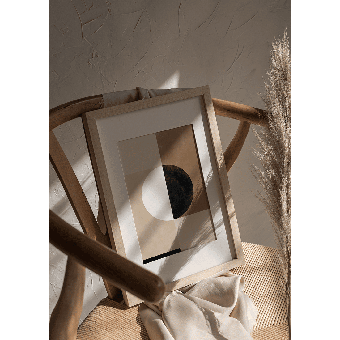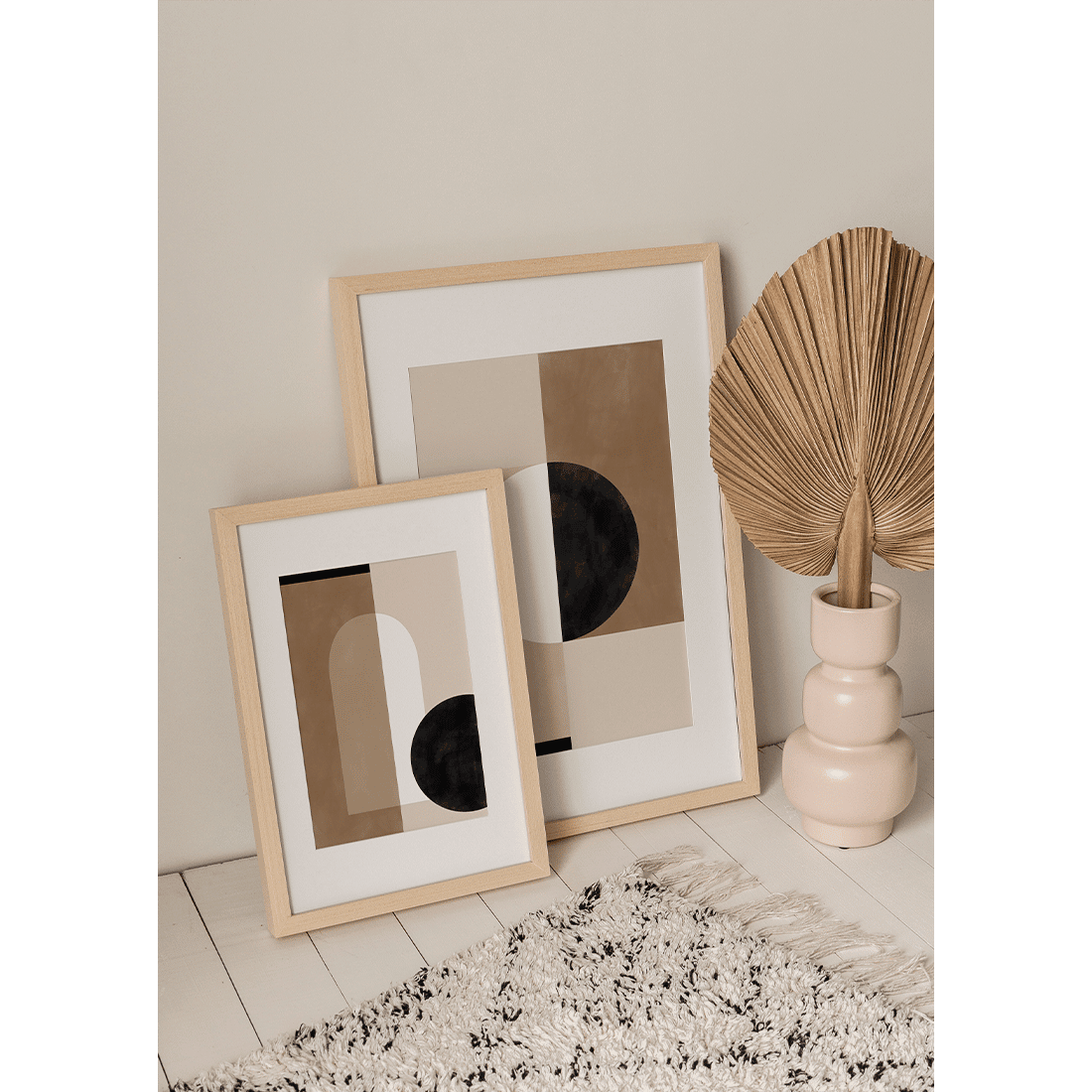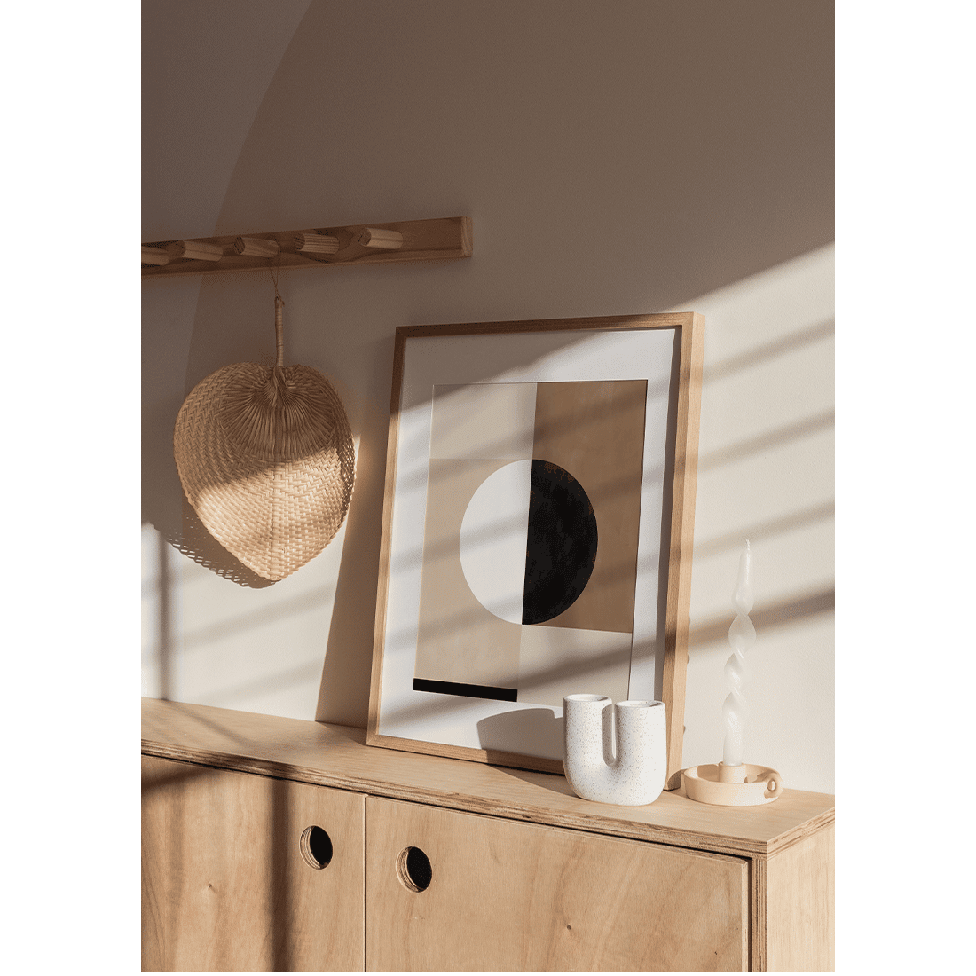 Graphic illustration with various geometric shapes in black, white and beige. This playful print is a great fit for a room where you want to add a modern touch, and when put next to Arch and Circle Poster No.1 you’ll have a perfect pair!