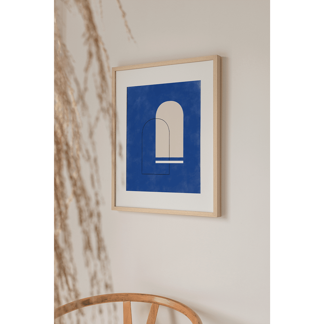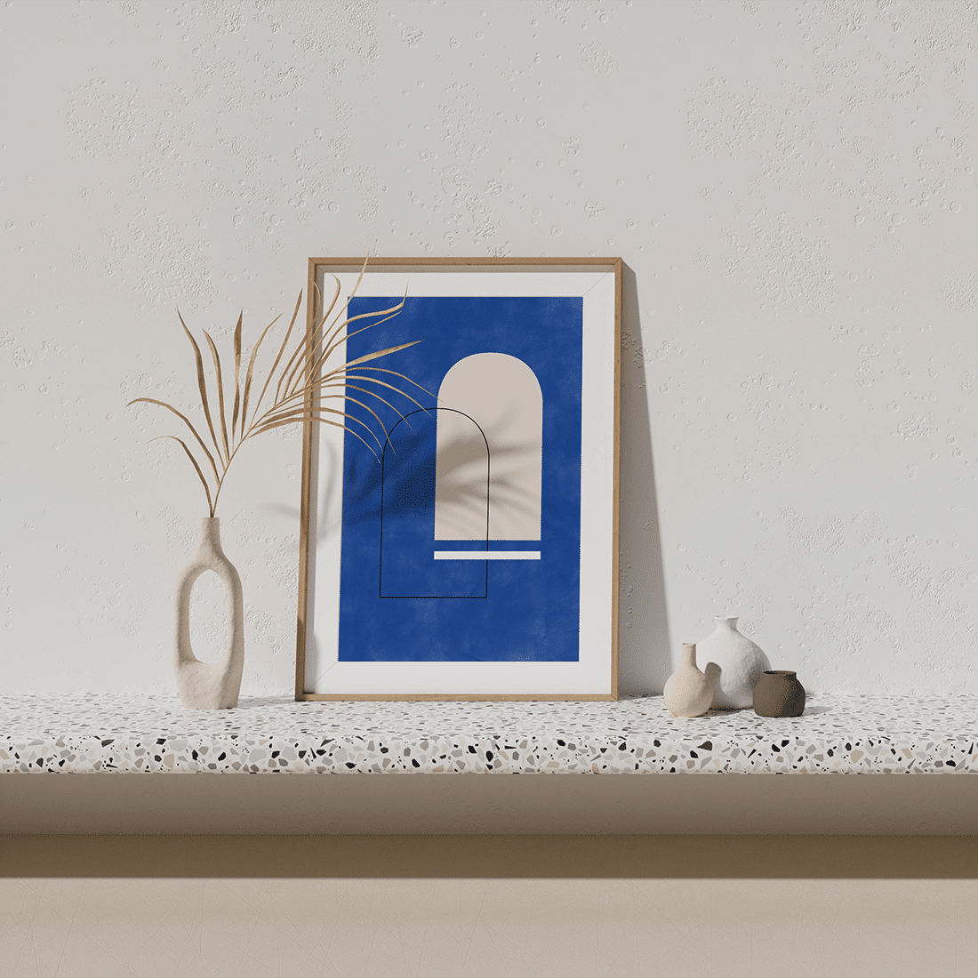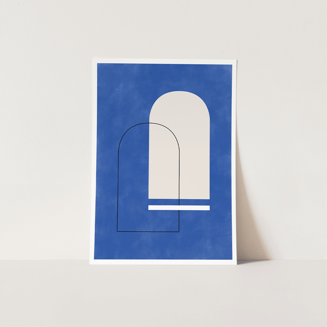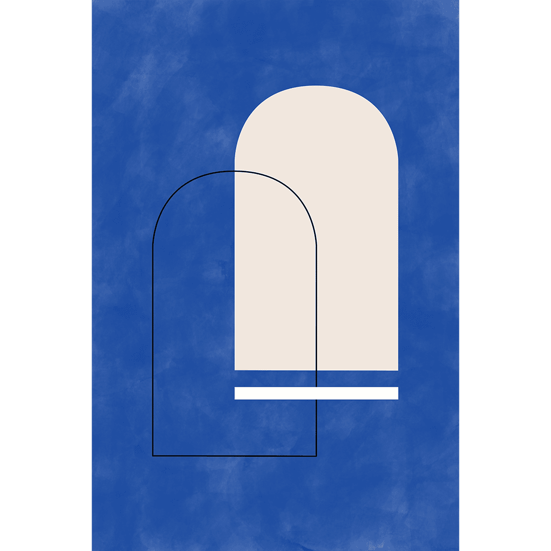Graphic illustration of arches in black outline and beige on a blue painted background. Creative art with modern colours perfect for the minimalistic home interior.