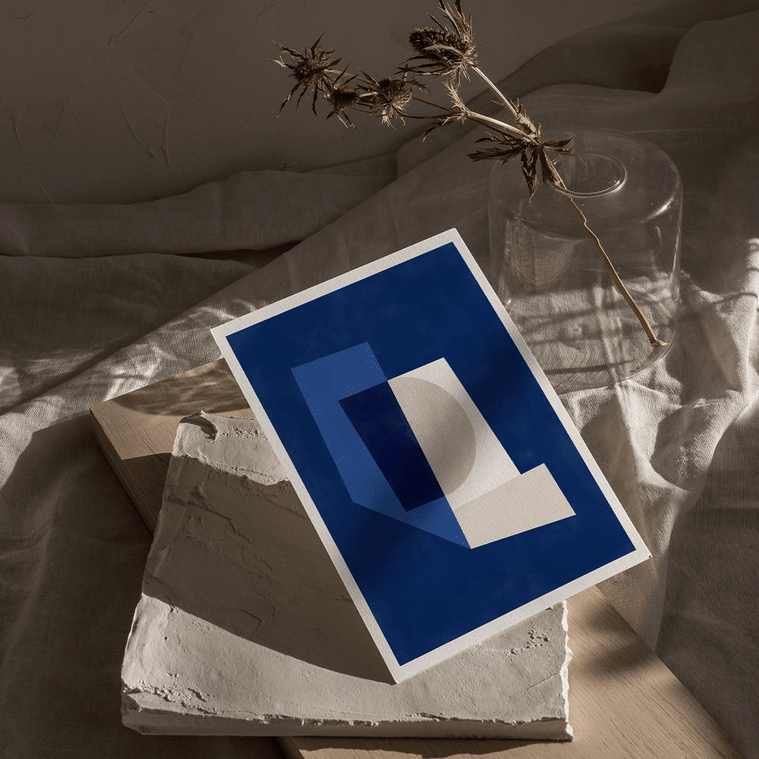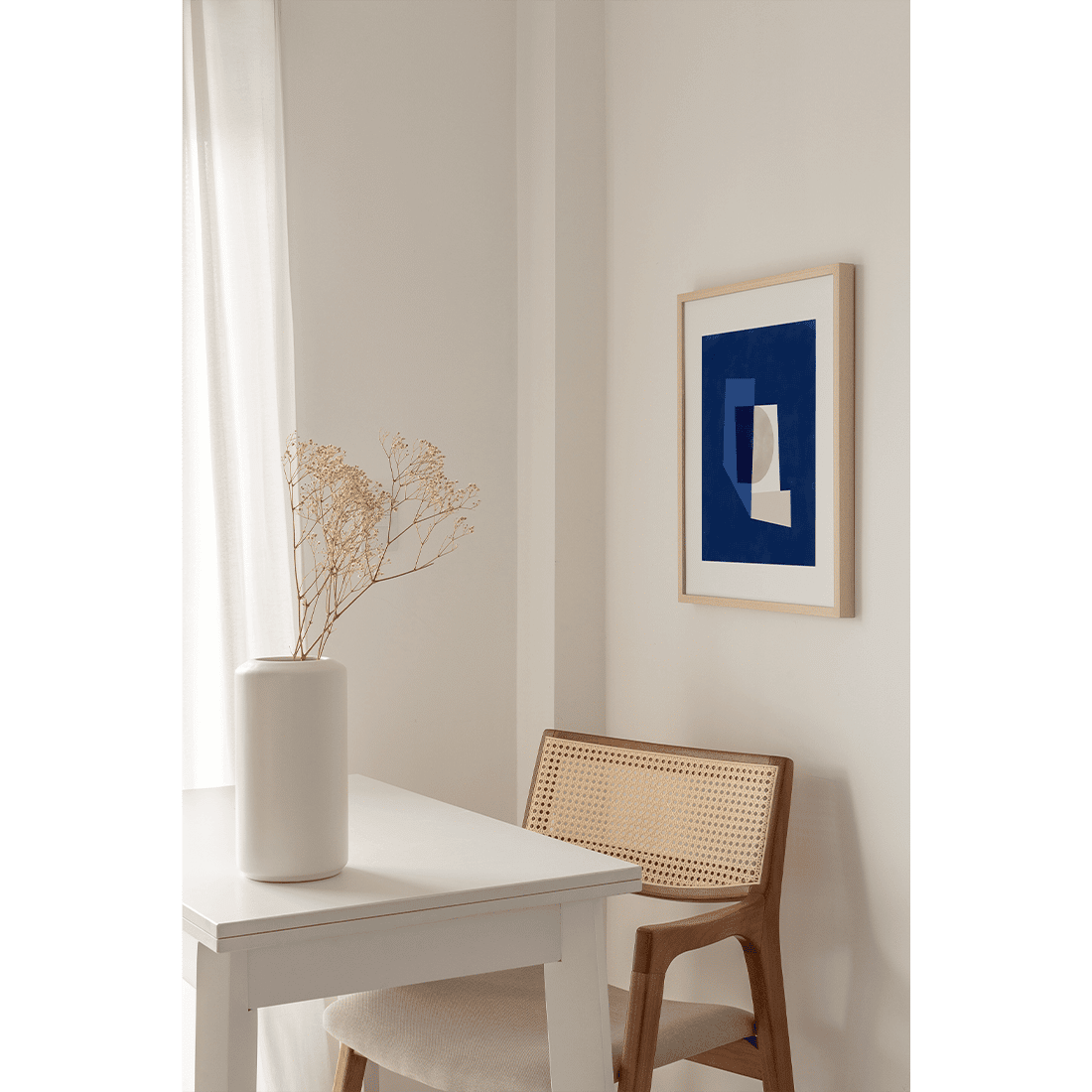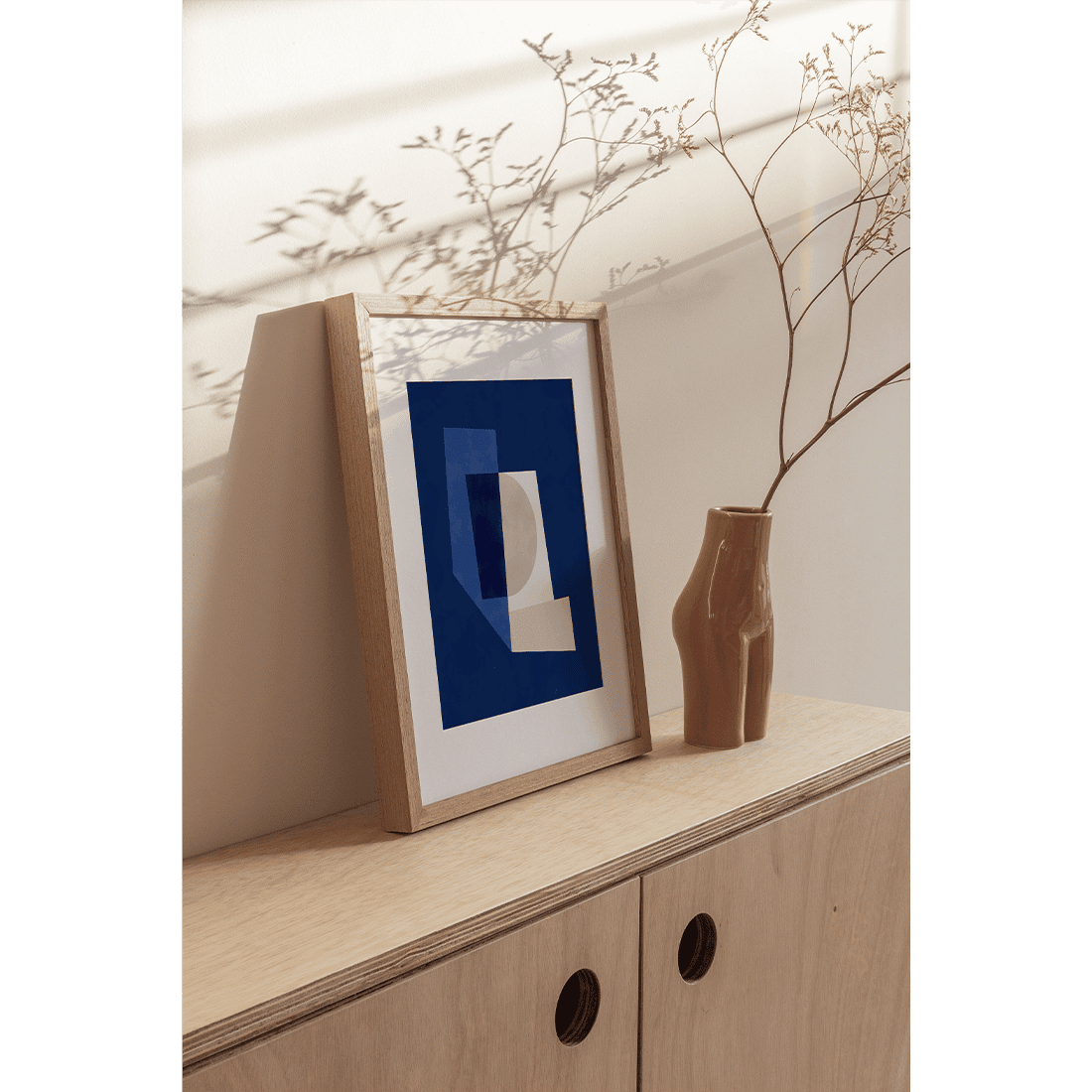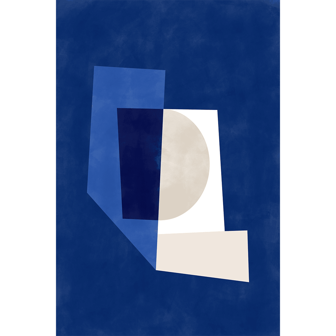 Graphic illustration of geometric forms painted in blue, navy and beige on a navy blue background. Creative art print with modern colours easy to pair with Blue Geometric Poster No.2!