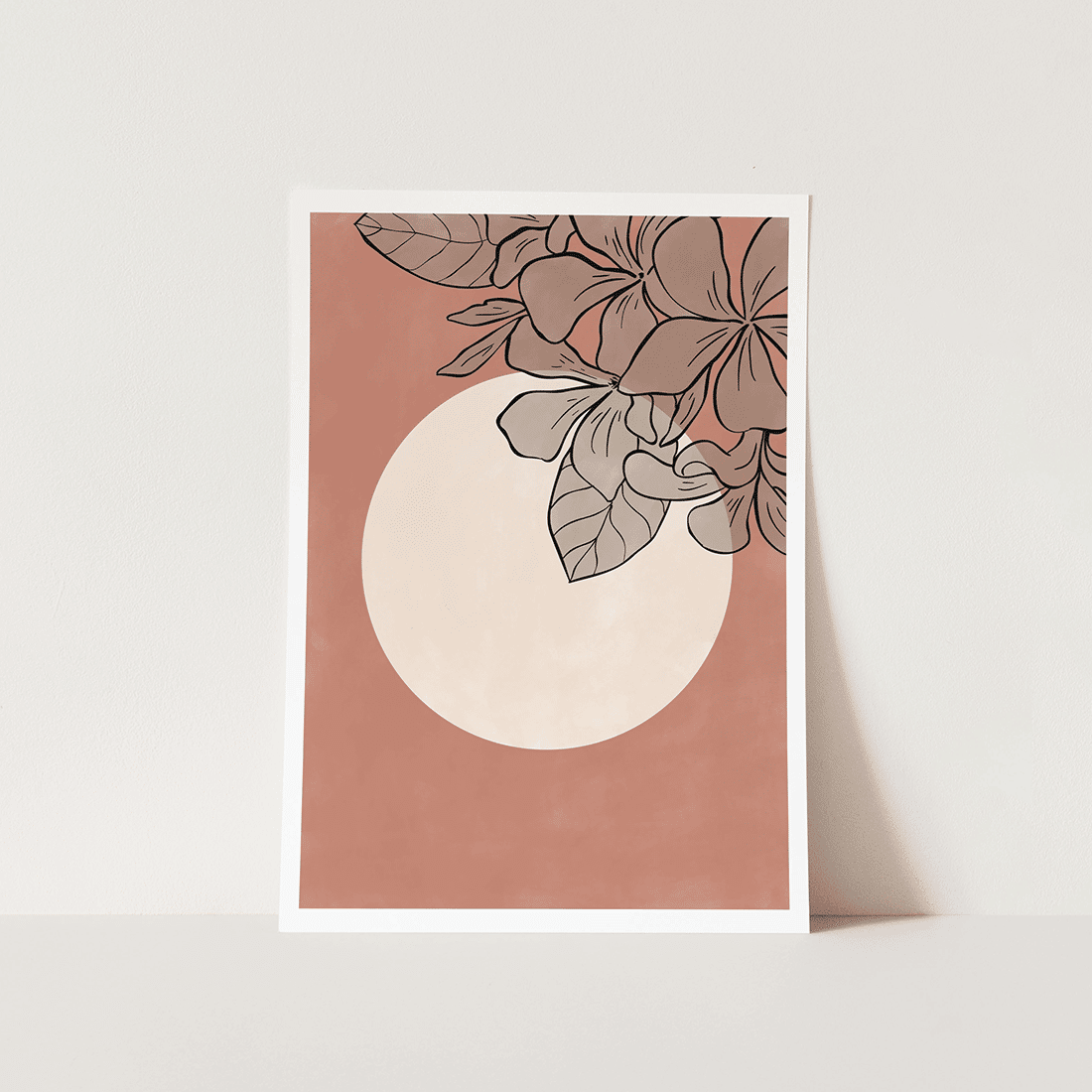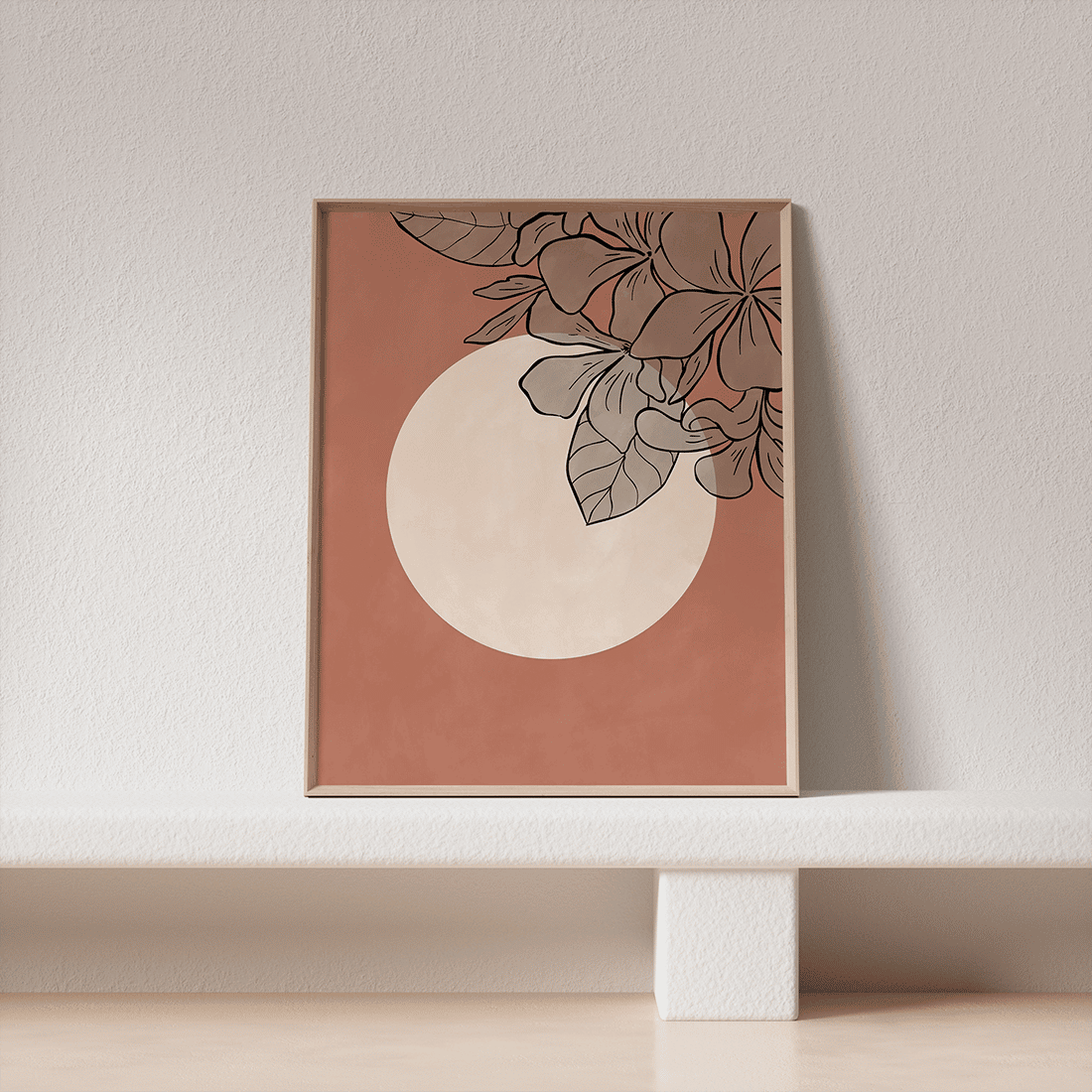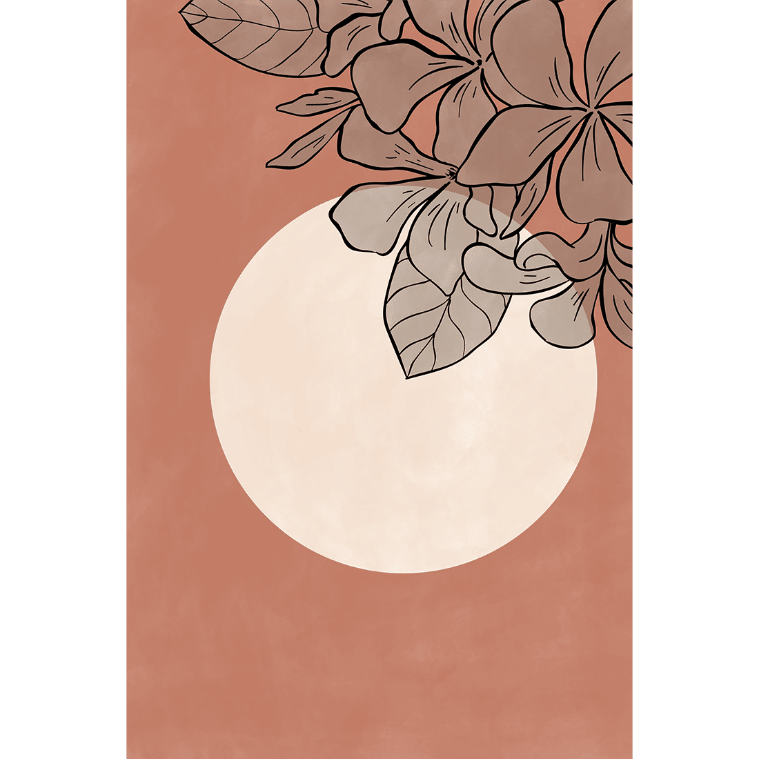 Graphic illustration of leaves in brown with a sun behind them, against a terracotta painted background. Graphic art will take your interior style to a new level, and this print will also make a perfect pair together with Botanics & Sun Poster No.1 and No.2.