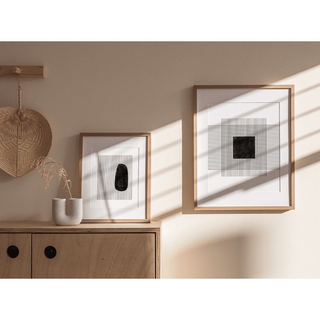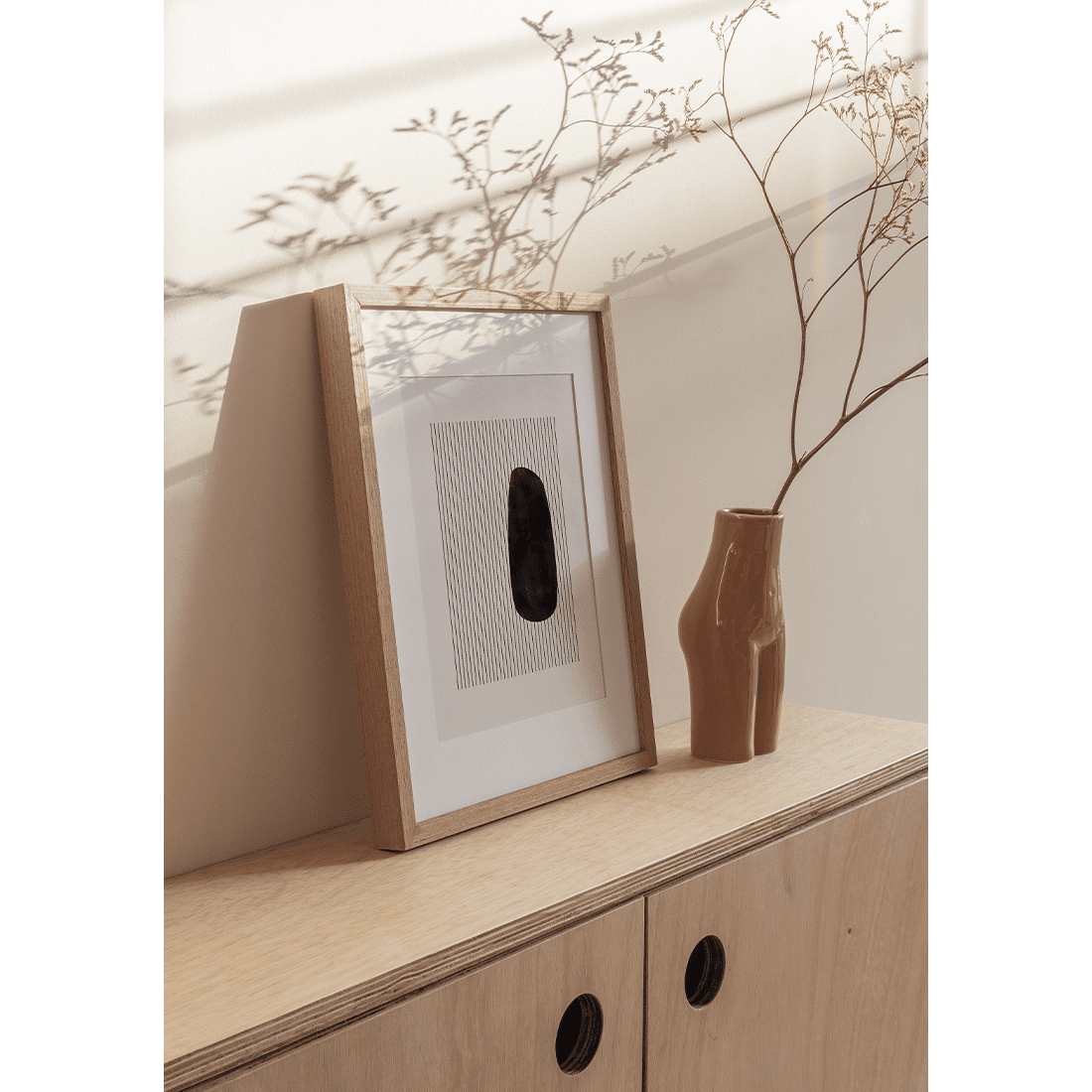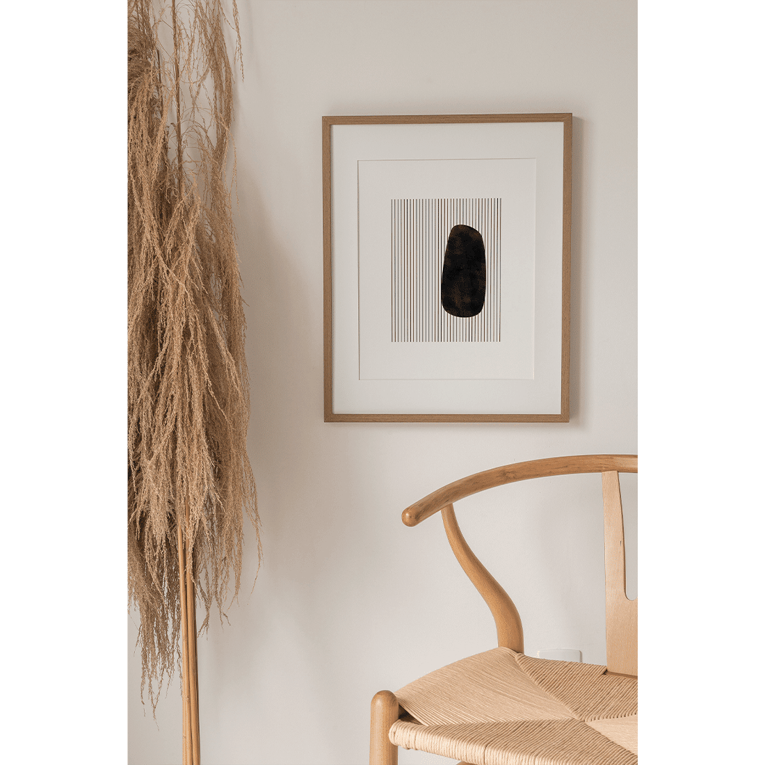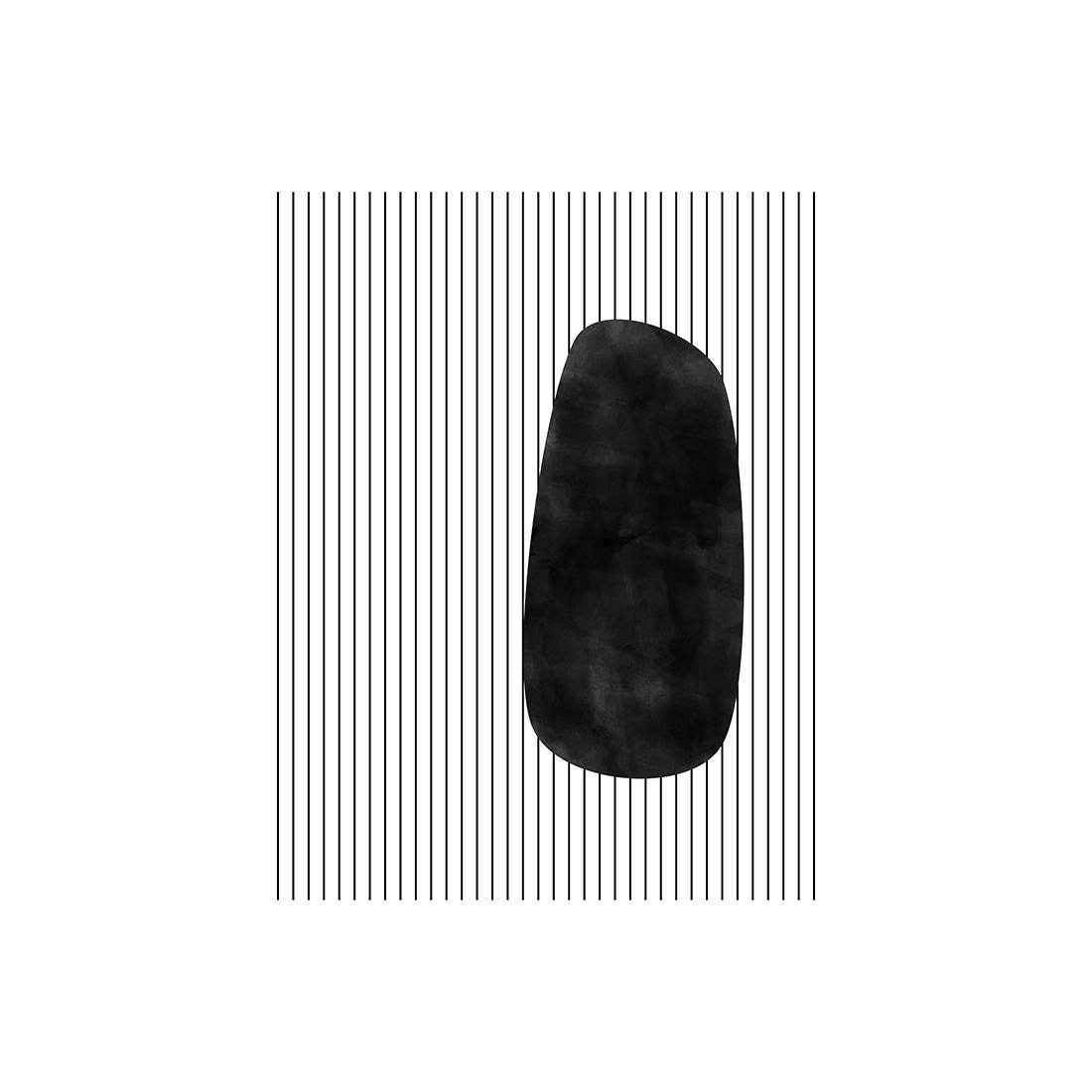 Graphic illustration with black lines and abstract organic shape in black on a white background. This print fits well in the mid century style of interior and pairs well with Classic Contrast Poster No.4.