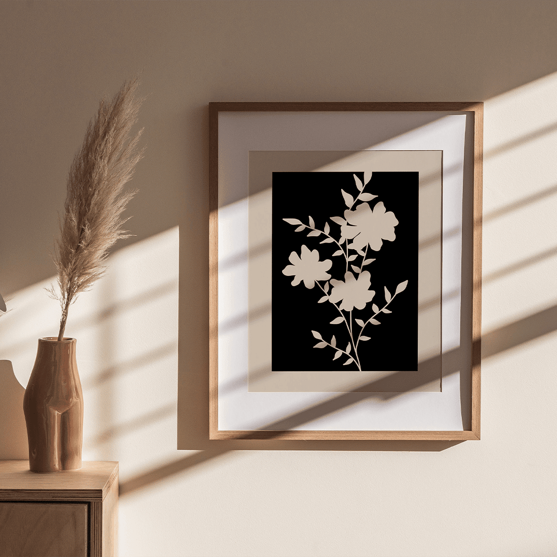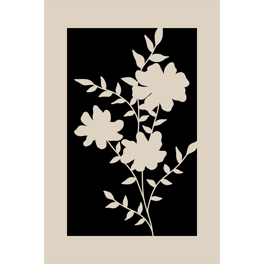 Illustration of beige flowers on a black background. Draw everyone’s eye to your walls with this beautiful illustration! Combine this print with Flower Silhouette Poster No.1 and No.2 for a perfect gallery wall!