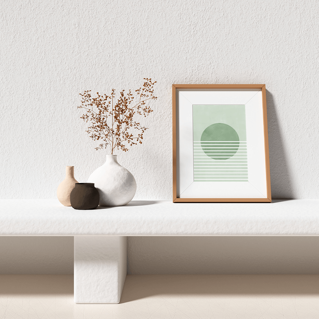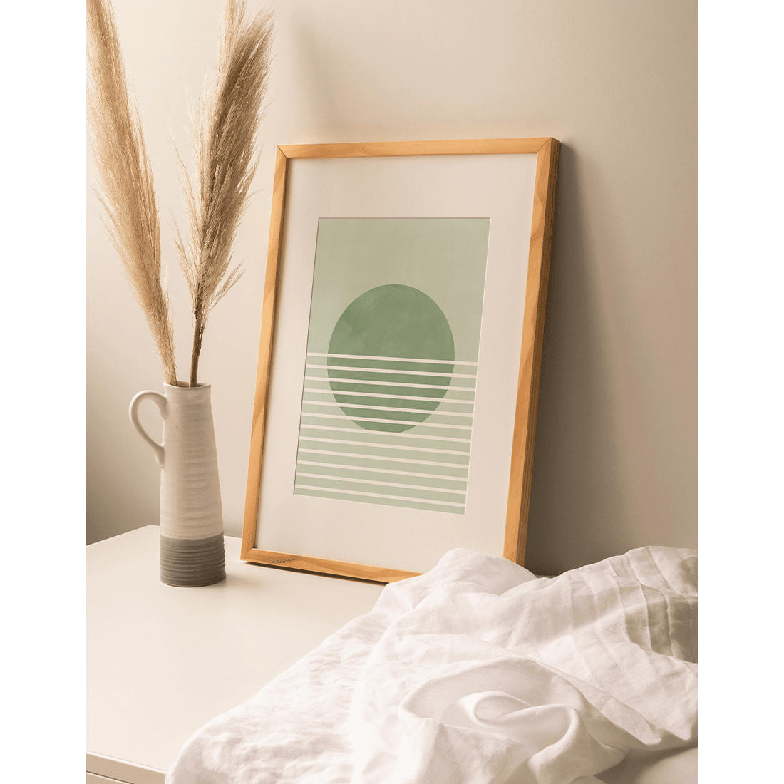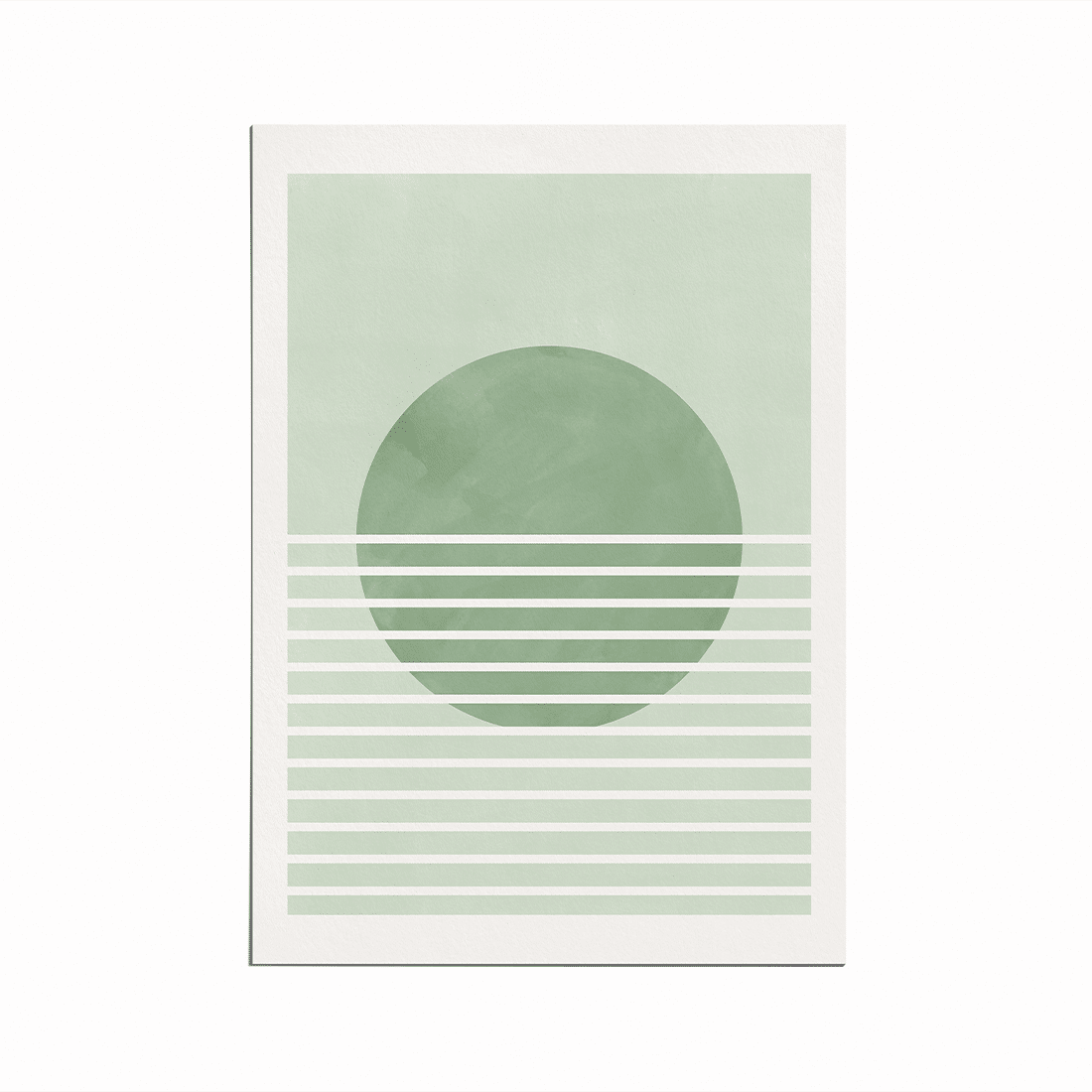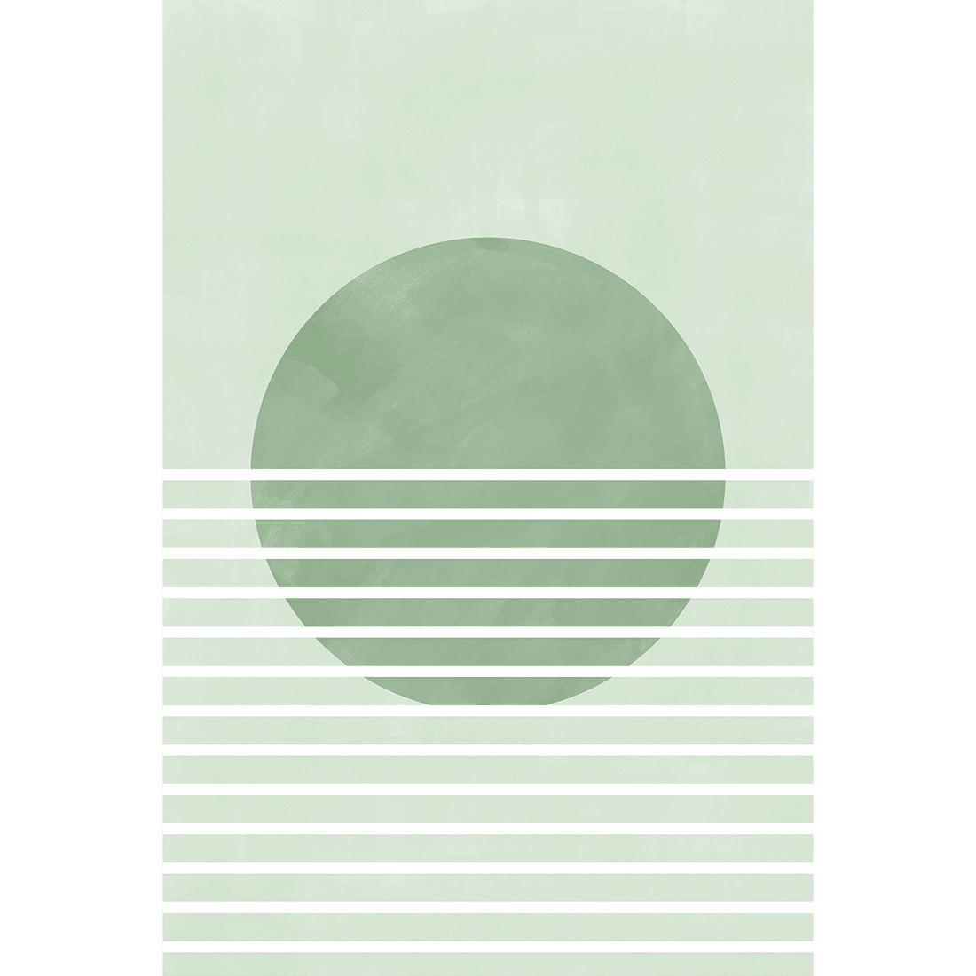 Graphic illustration of a landscape with a green circle in the middle and thin white lines against a light green background. The earthy hues create a warm and soft style, and this print is perfect to pair with wall art from our “Nature Lover” collection.