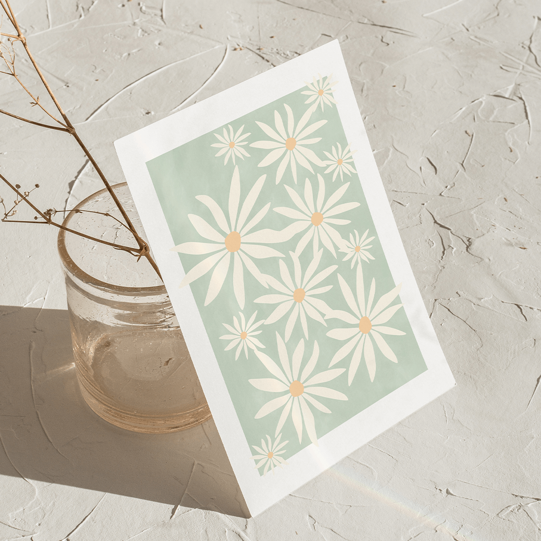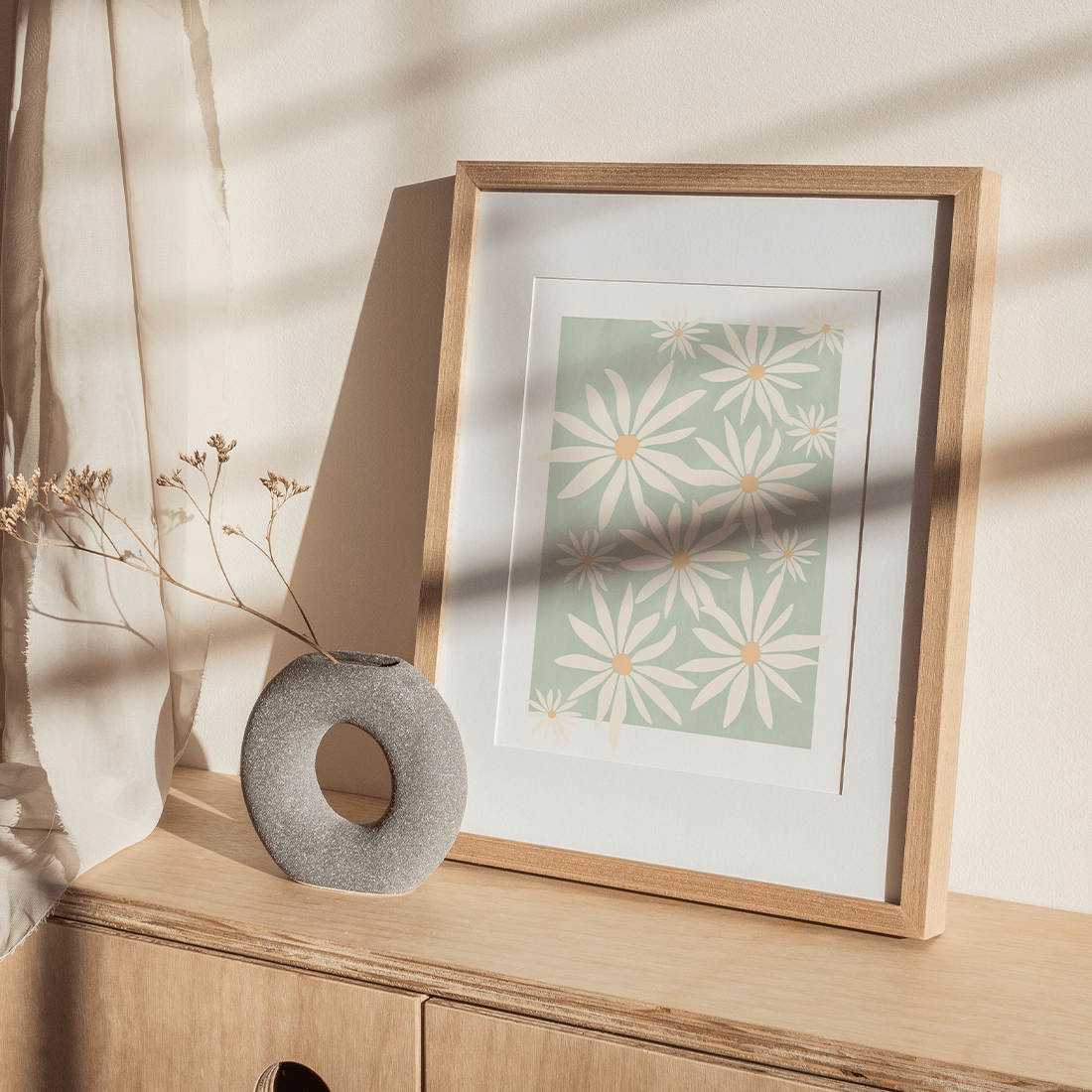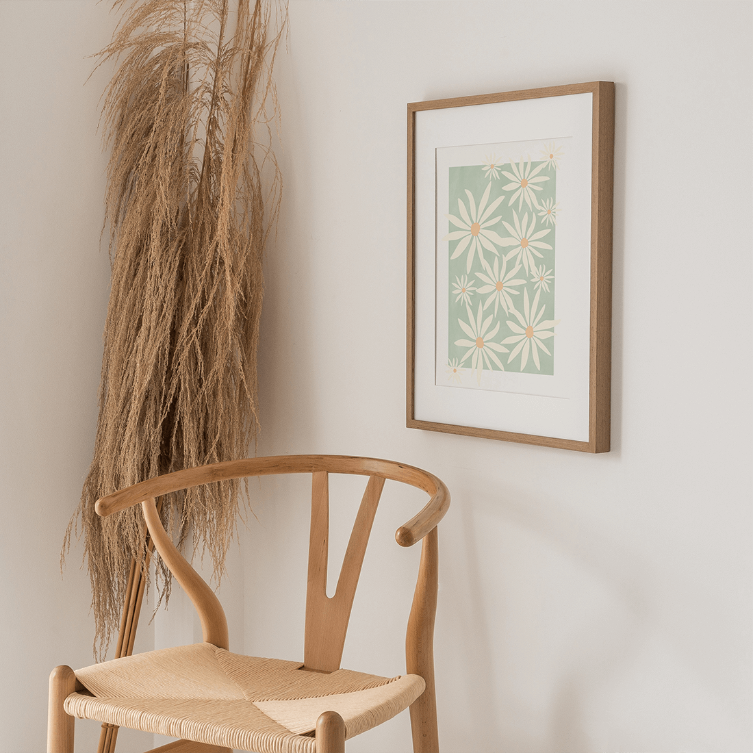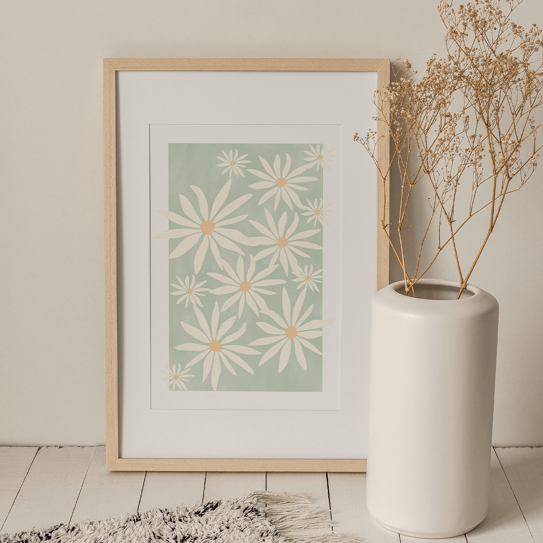 Illustration of white flowers with a light green textured background. Adding modern art prints to your walls will give your home an up-to-date look and keep things looking fresh!