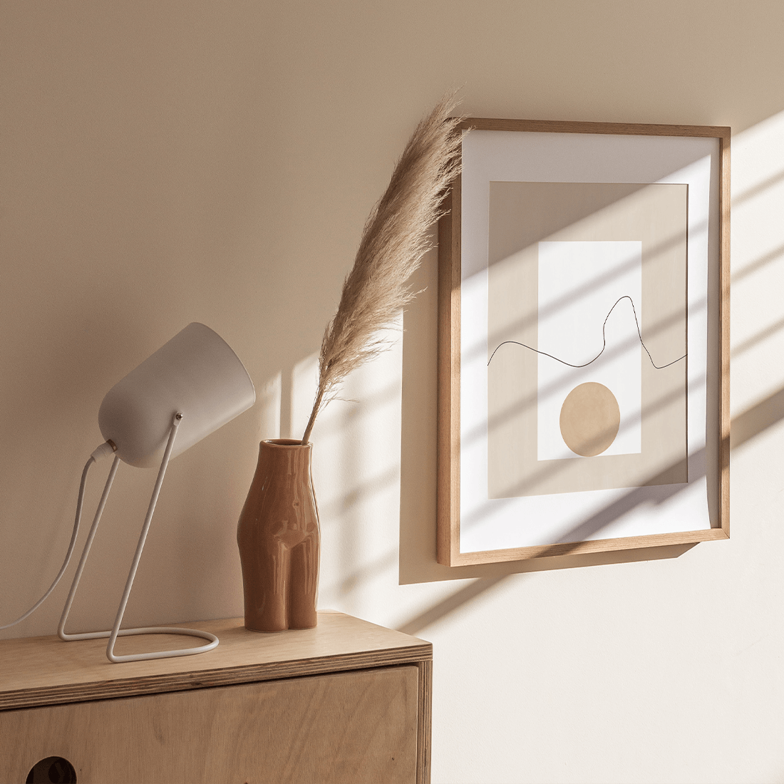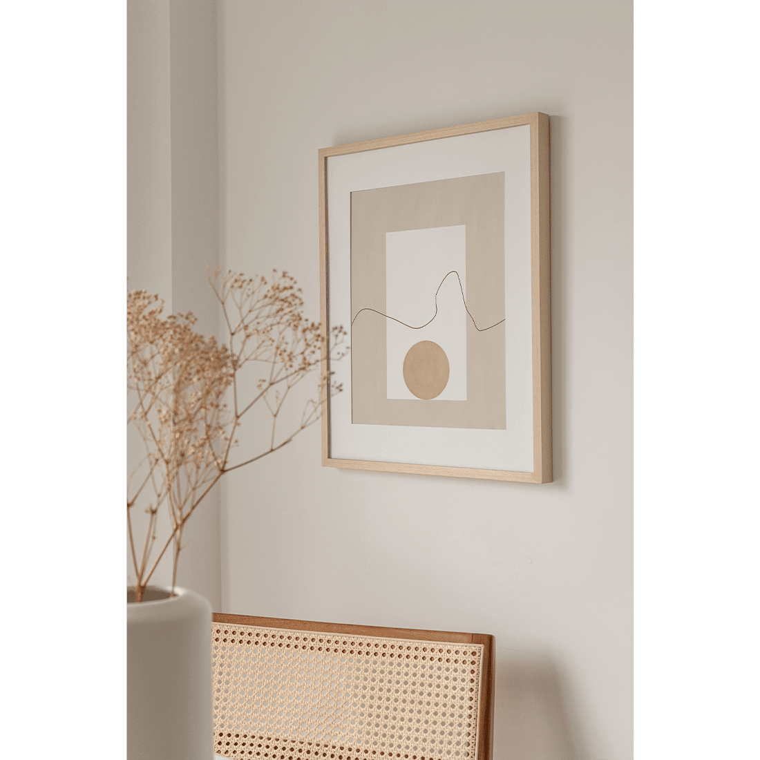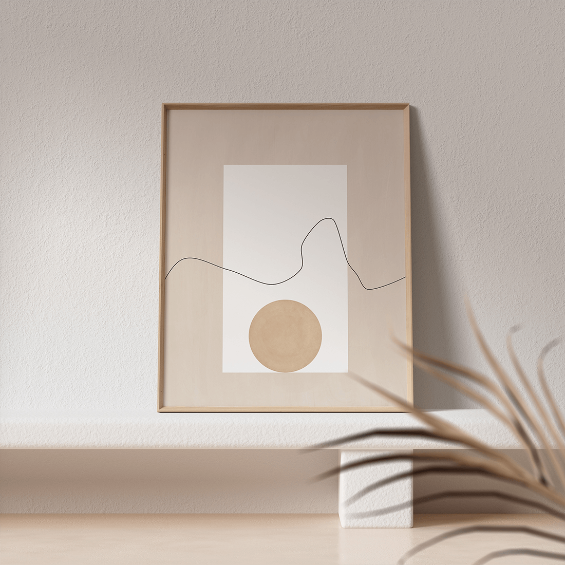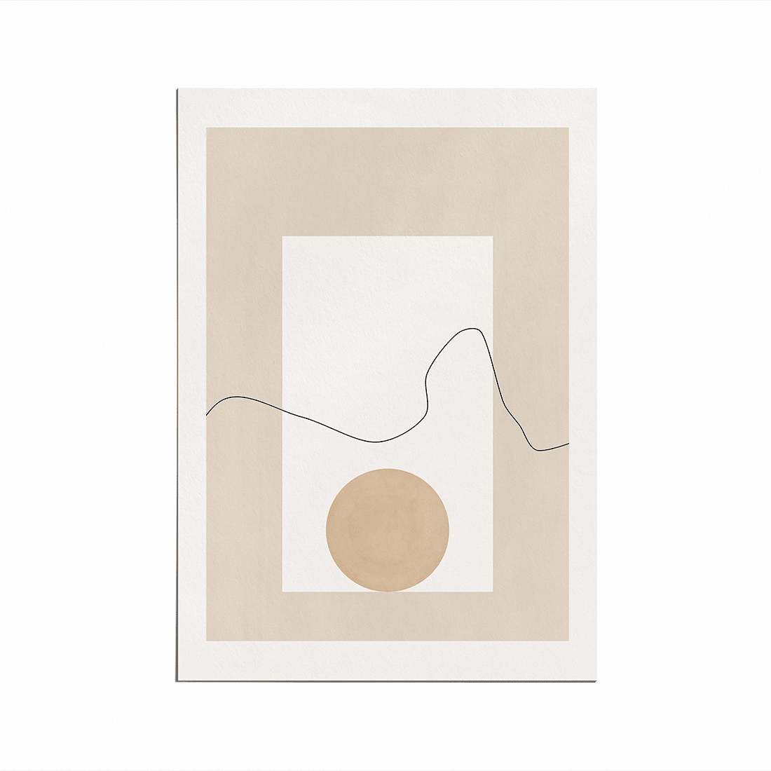 Neutral illustration with geometric shapes in brown and white on a light beige, textured background. The earthy tones in this beautiful print will give your home a clean and minimalistic look whilst still bringing a bit of life into your space!