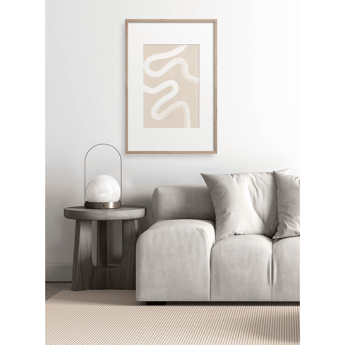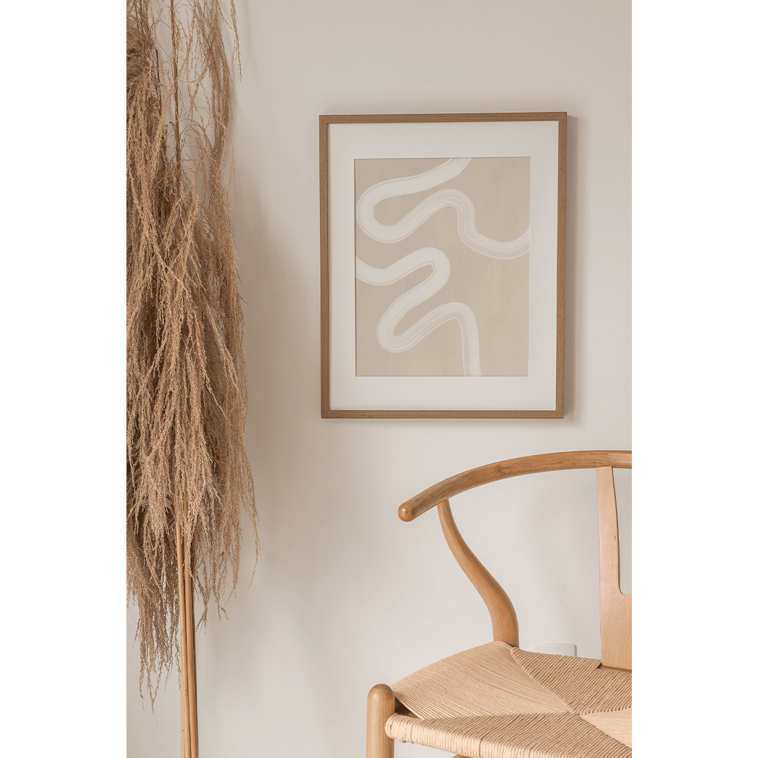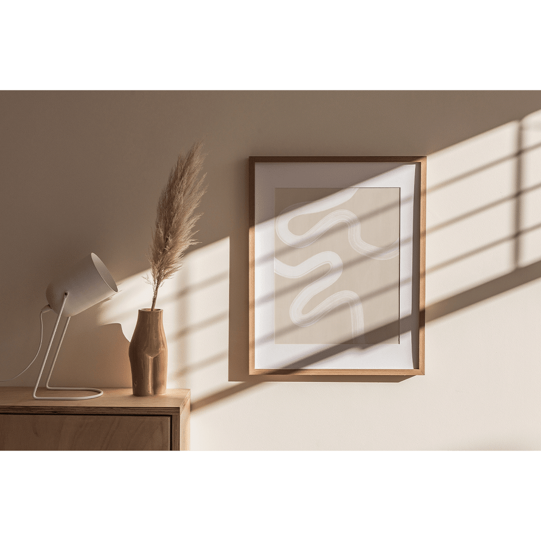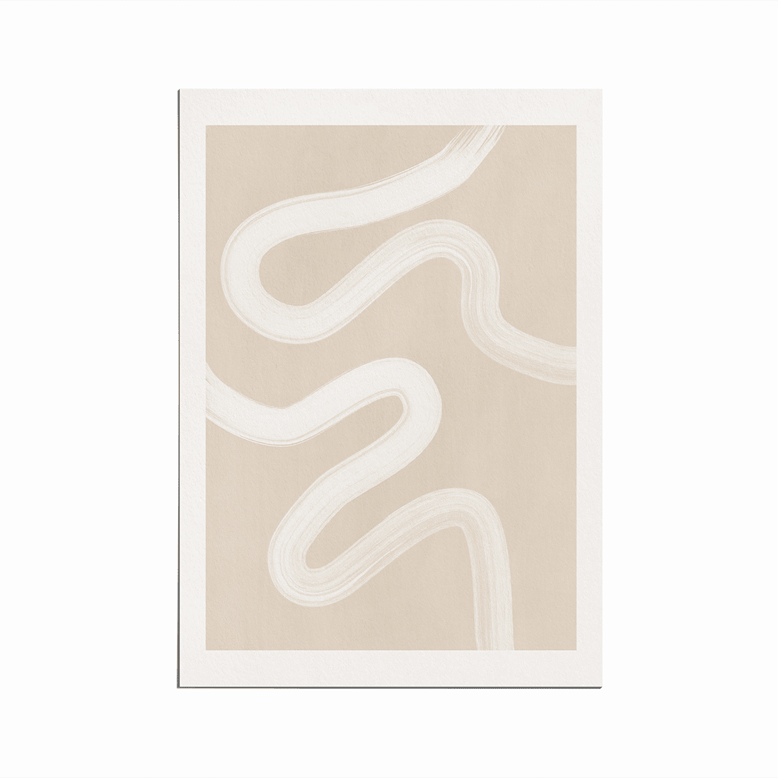 Graphic illustration with thick white brush stroke on a light beige background. The perfect neutral print to add to your home for a modern and relaxed vibe.