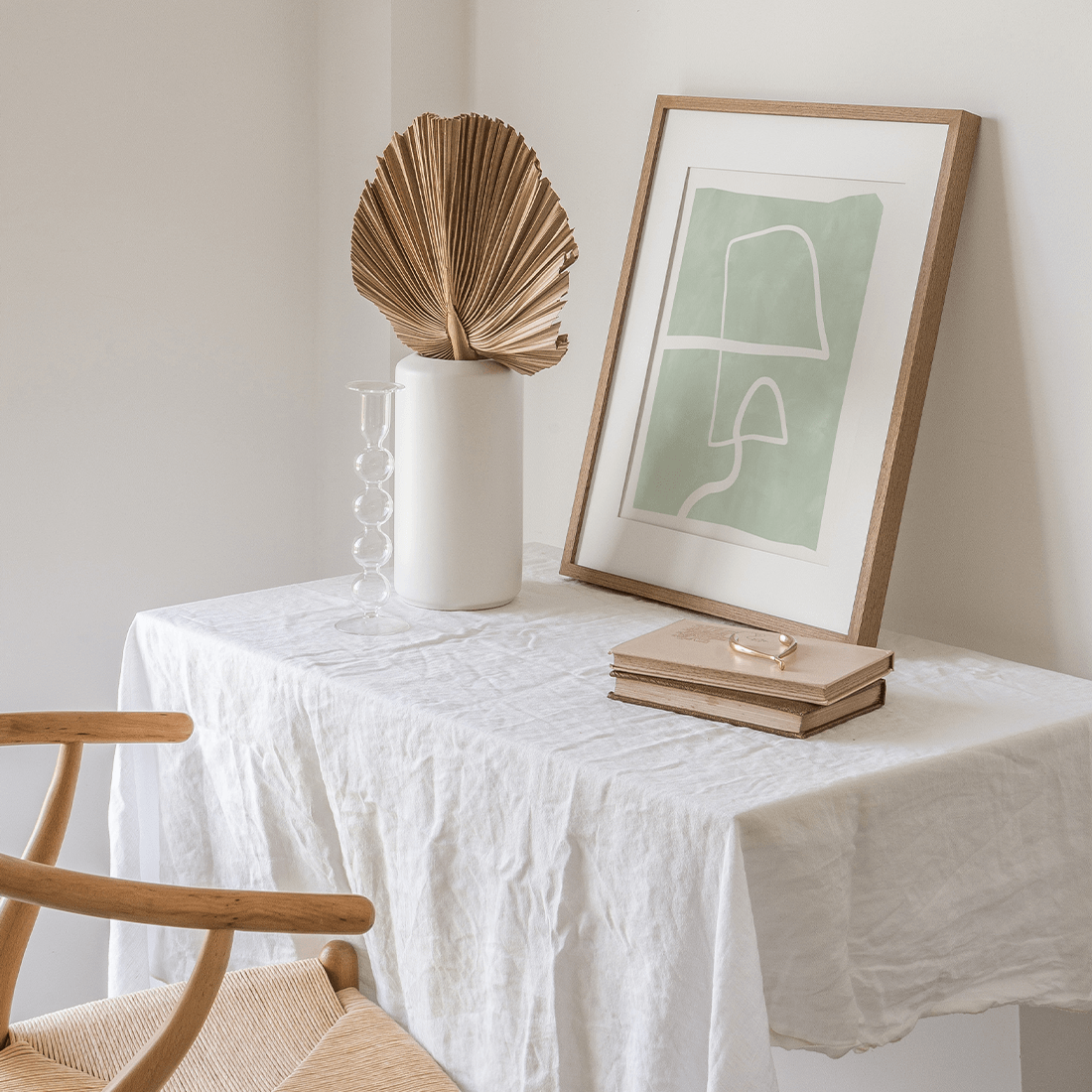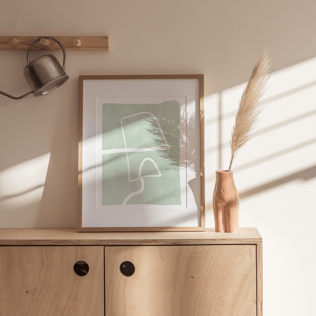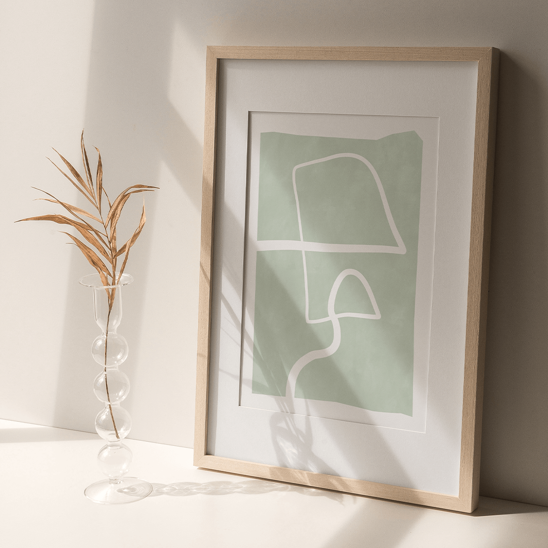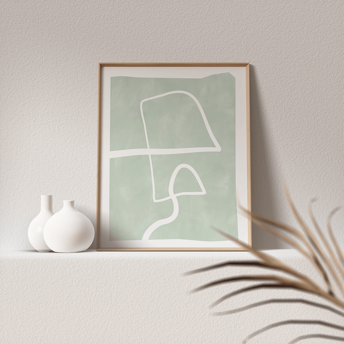 Graphic illustration with a thin, white swirl on a light green textured background. This minimalistic illustration will fit well in both living rooms and bedrooms, and especially together with Pastel Single Line Poster No.2.