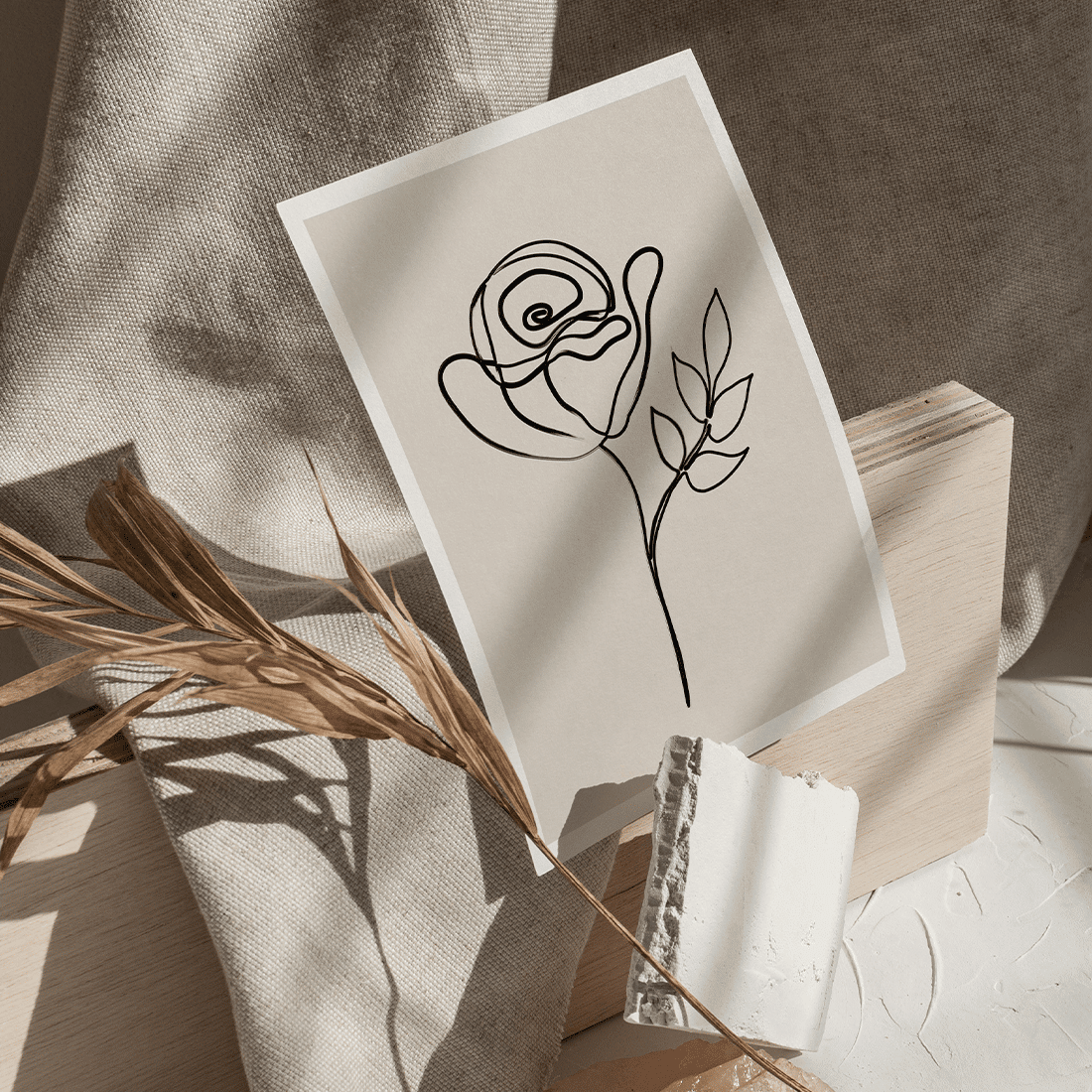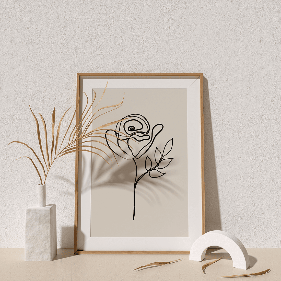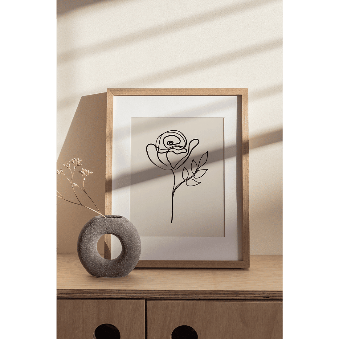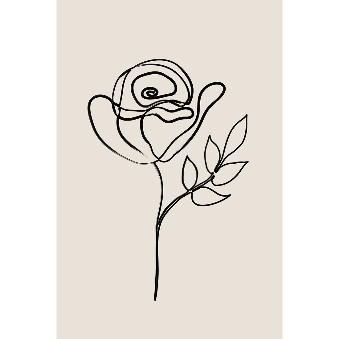 Illustration of a flower in black line art against a beige background. This botanical illustration will look perfect in a bedroom as well as a living room, either paired with more line art or botanical prints.