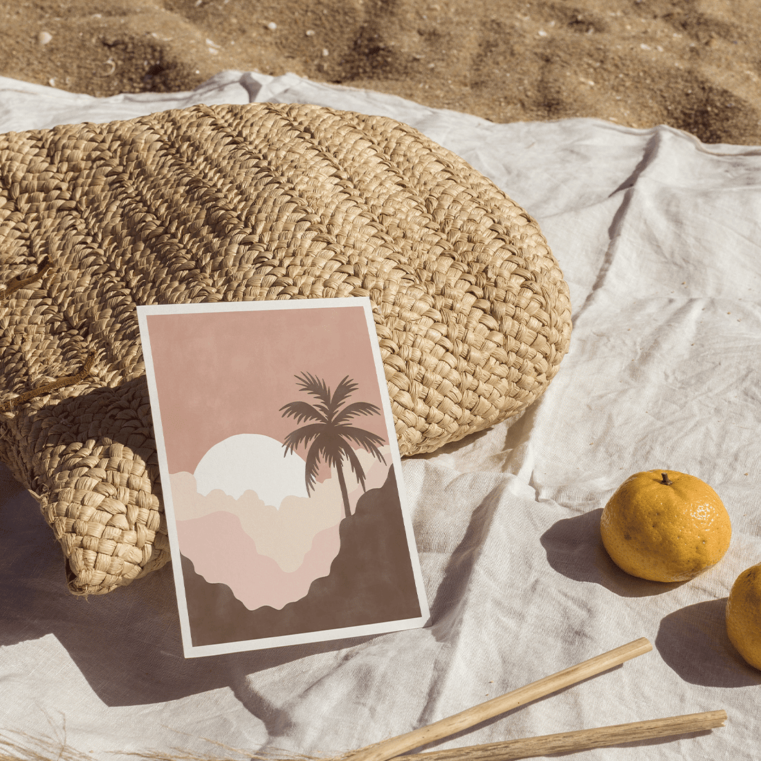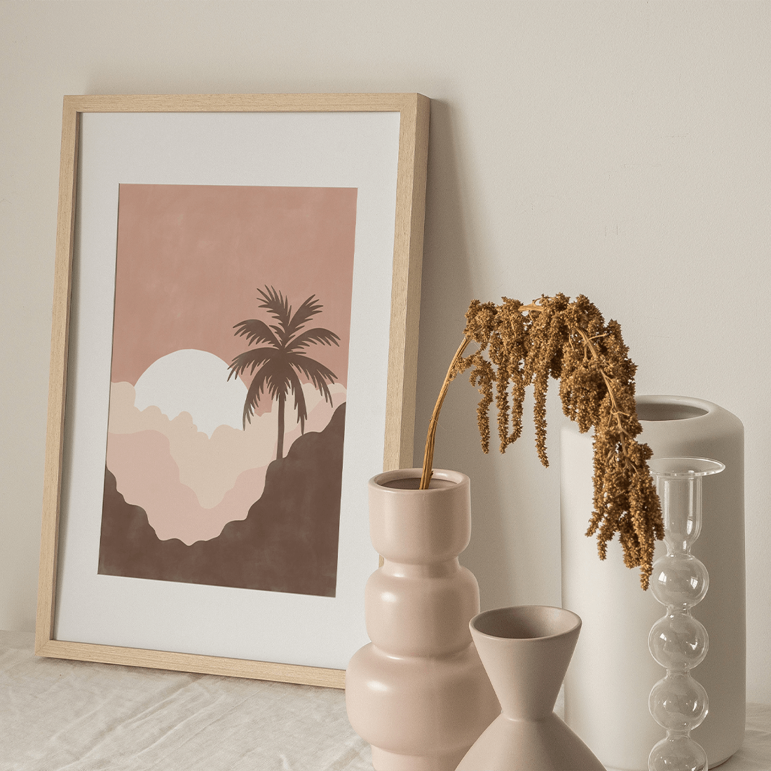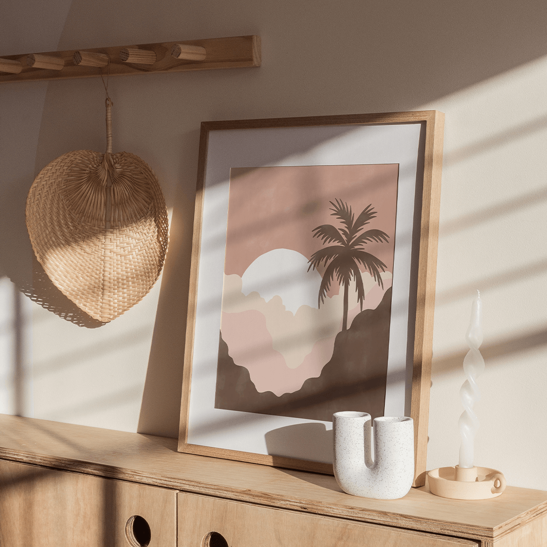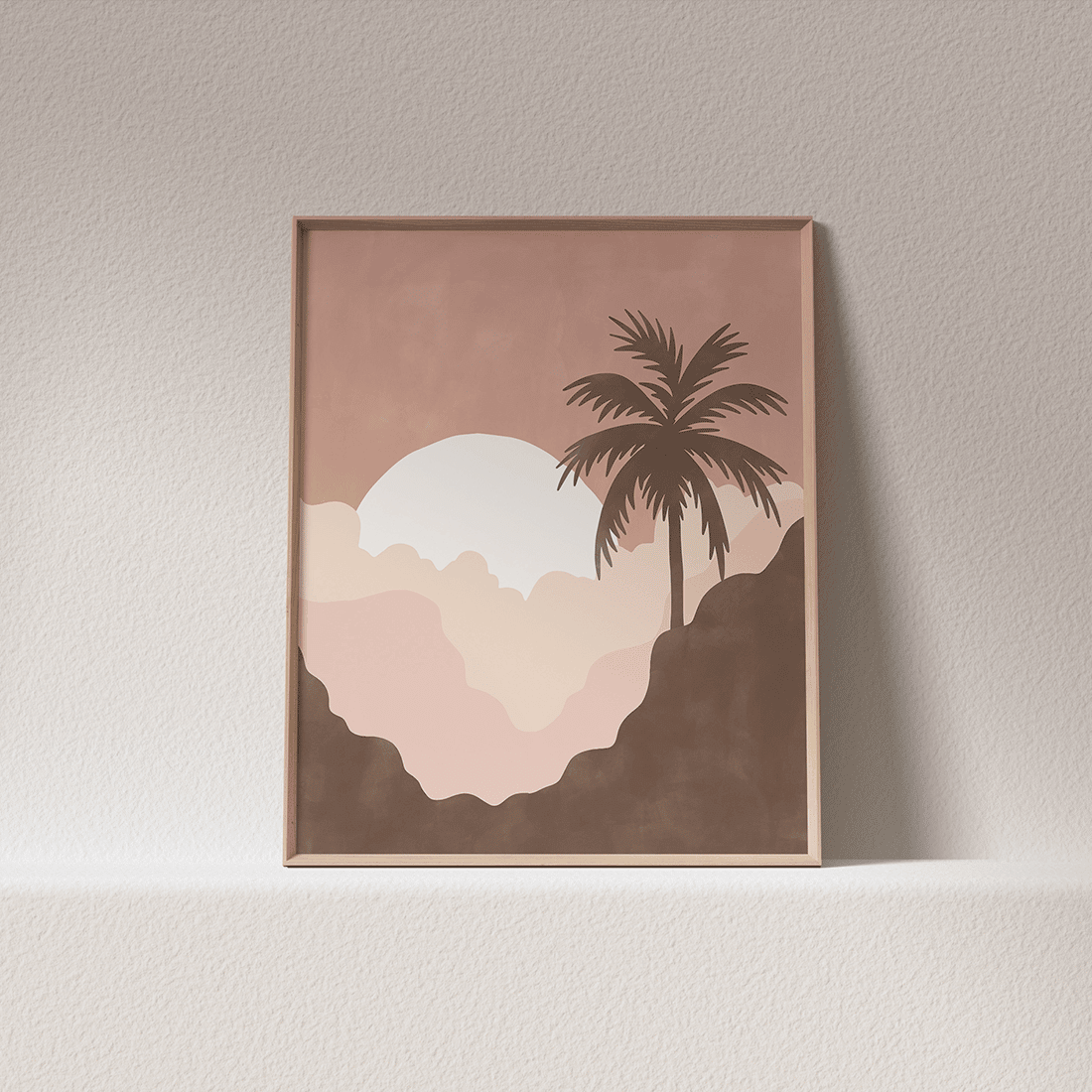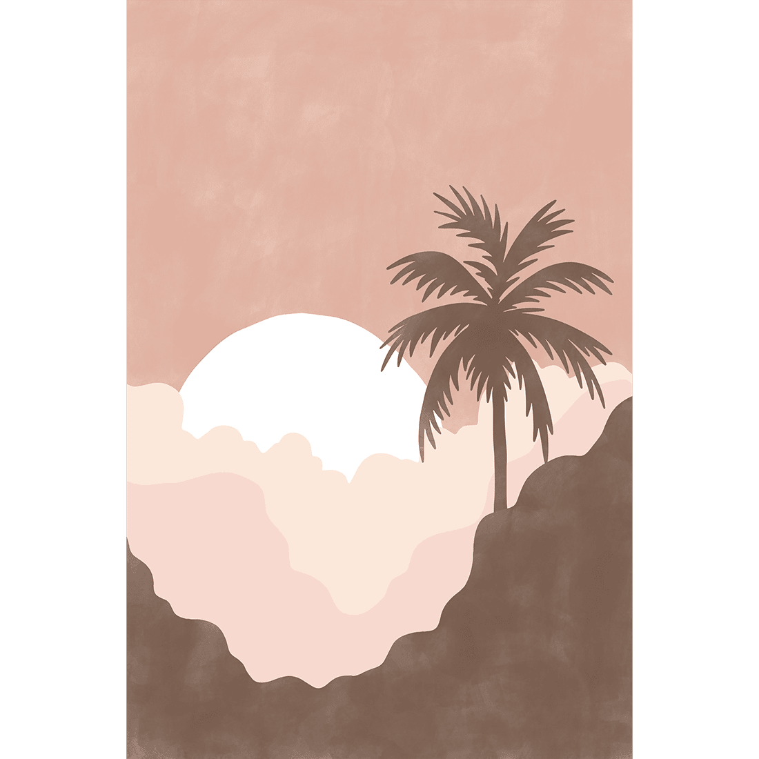 Graphic illustration of a painted sunset with a palm tree in beautiful pink shades. Pair this poster with Summer Landscape Poster No.2 and bring the summer vibe into your home!