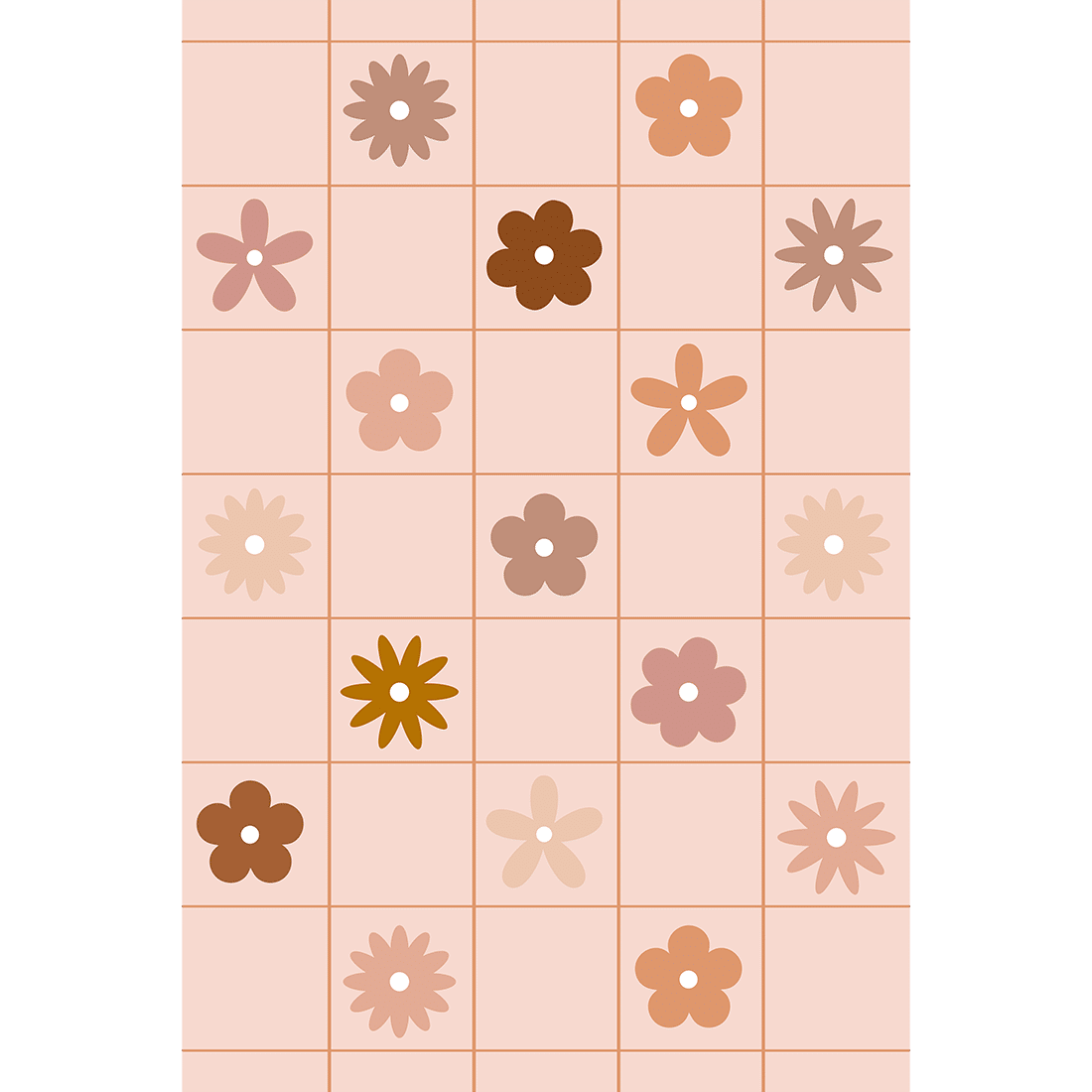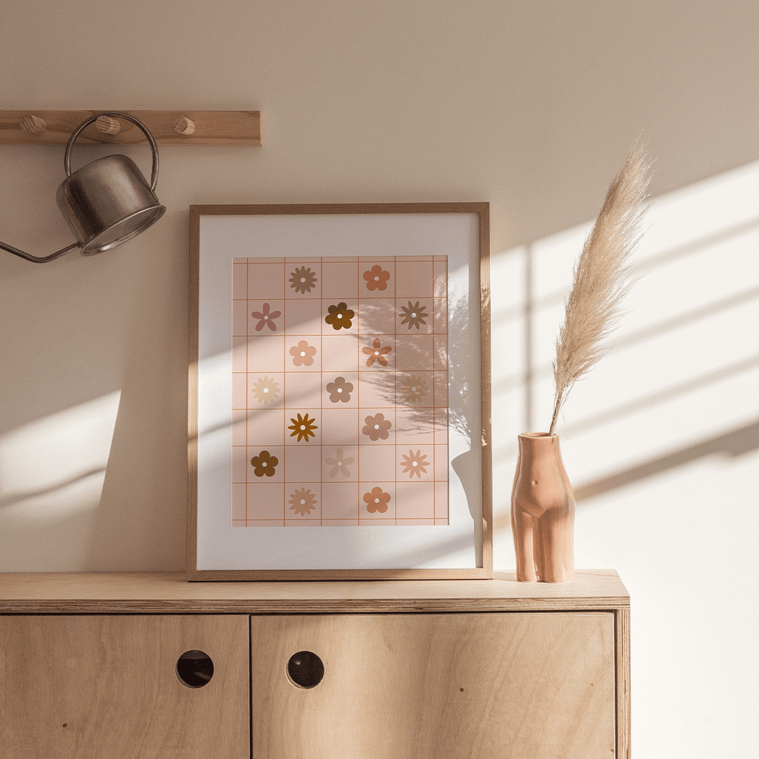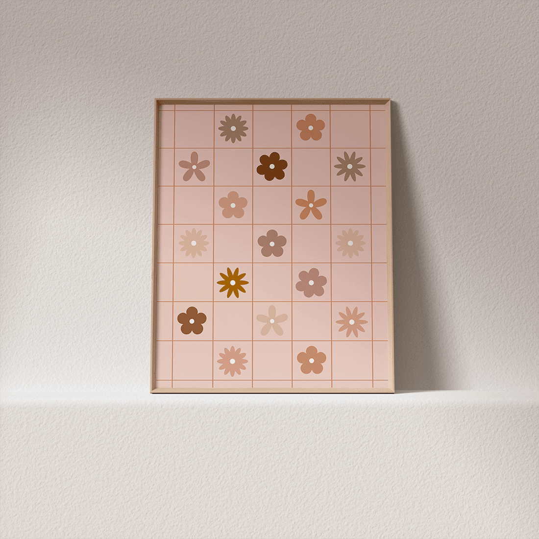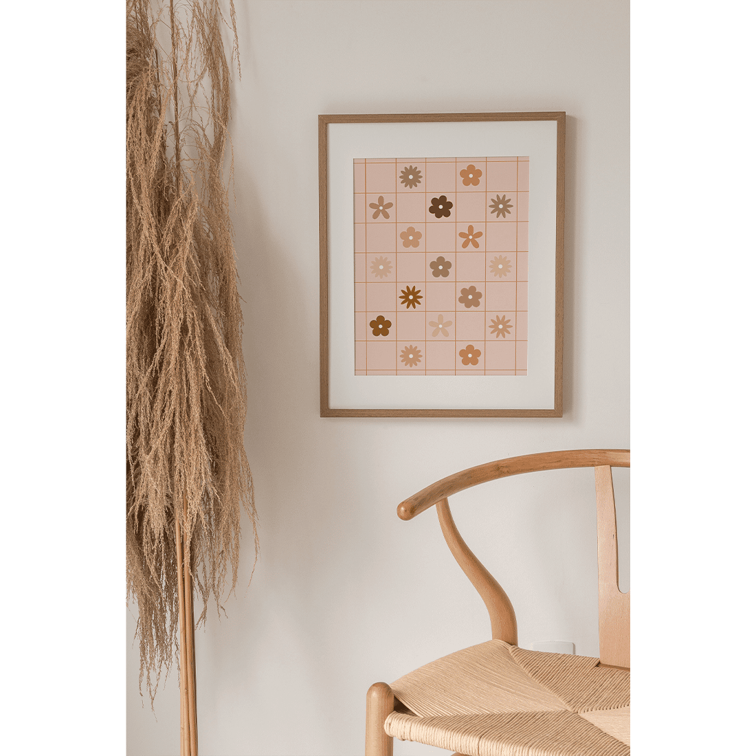 Illustration of cute flowers in pink and terracotta on a light pink background. The soft colours and minimalistic style makes this print perfect for a modern and trendy home!