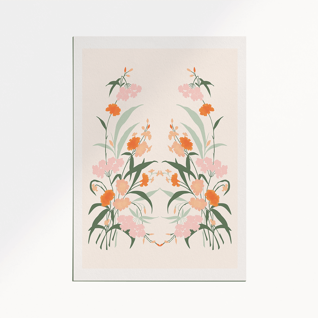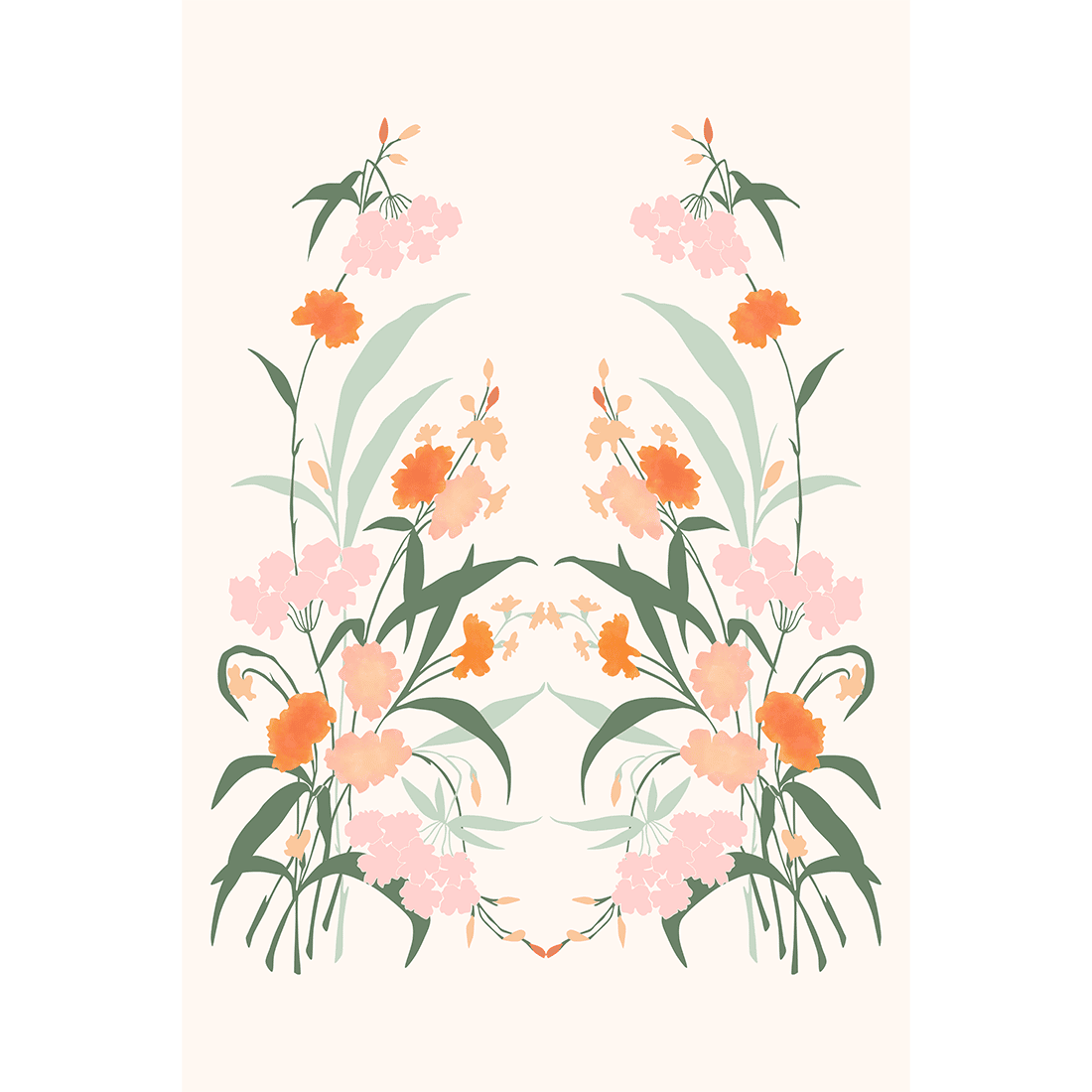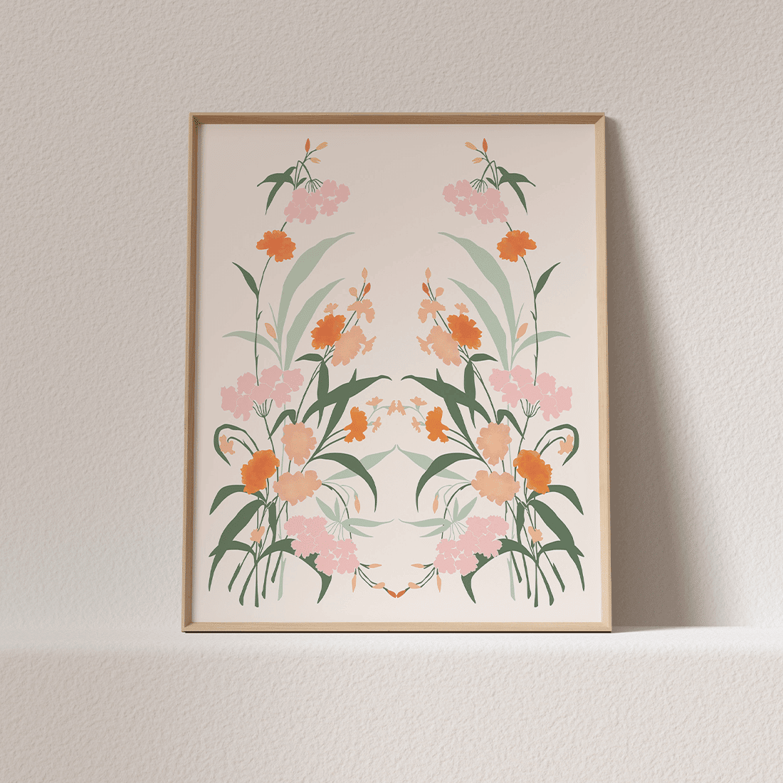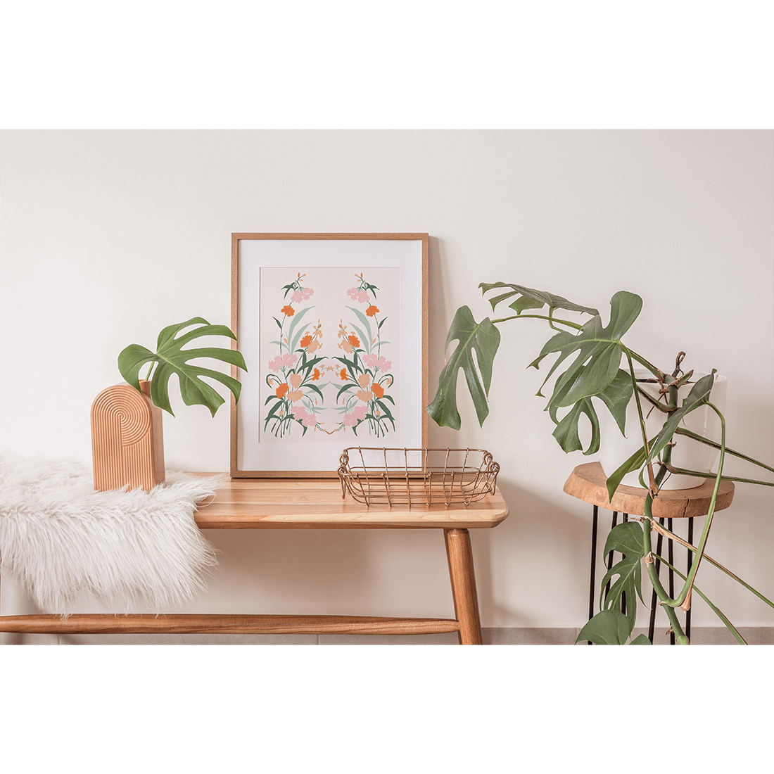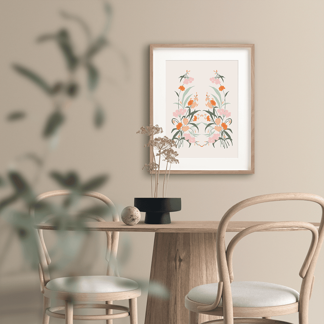 Graphic illustration of colourful flowers and leaves on a light background. Decorating your home with colour will make it feel much more cosy and unique. Find more matching art in our Botanical category!